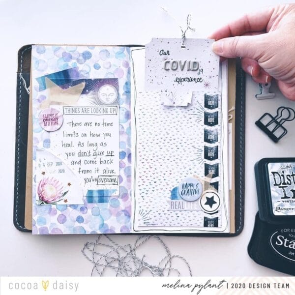Our final design is from Melina. “My project today is raw. It needed to be. I needed torn edges and crumpled accents to go along with the content. Being sick is never fun. Memory keeping about the experience, well sometimes we just skip completely over it. I didn’t want to do that this time. But for me to be able to write down the raw emotion I’m feeling, I felt it best to tuck it away on a tag in this library pocket I made.”