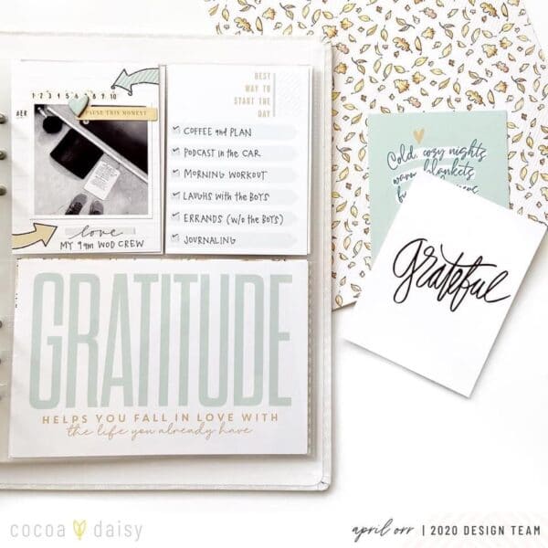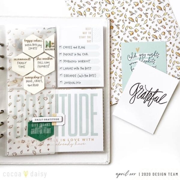 Cocoa Daisy pocket cards can be used to tell lots of different stories and most of the cards are interchangeable with past kits. Today we are sharing to very different layouts created from the same pocket kit. We begin with a gratitude layout from April. She used vellum layers and hexies to create this design.