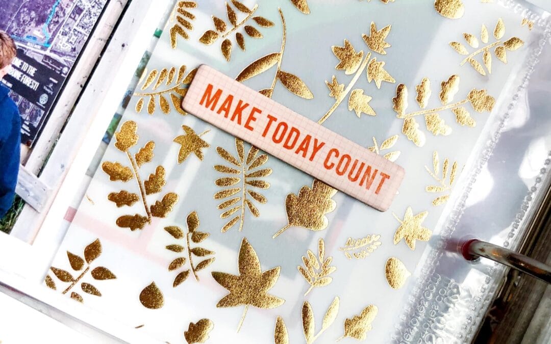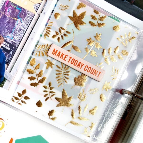 “I layered my large photo with some die cuts (love that they’re sticky now!) and the beautiful foiled leaf washi from the Memory Keeping Pocket Kit. Lately the Memory Keeping Sticker kit has been coming with this mini translucent sheet of script style words that is so cute, I used one on the tab at the top.”