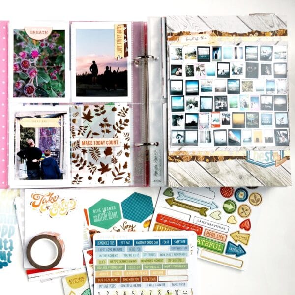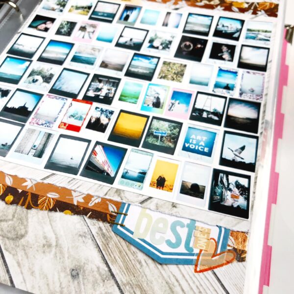 “I had a large square photo I took of a bunch of my fav summer instant photos that I wanted to feature. I was organizing them at the end of summer and realized just what a good one we had. I used my two favourite papers from the Memory Keeping Kits under it, the beautiful fall floral from the Pocket and Traveler’s Notebook Kits and the nice bright wood print in the Memory Keeping Classified Kit.”