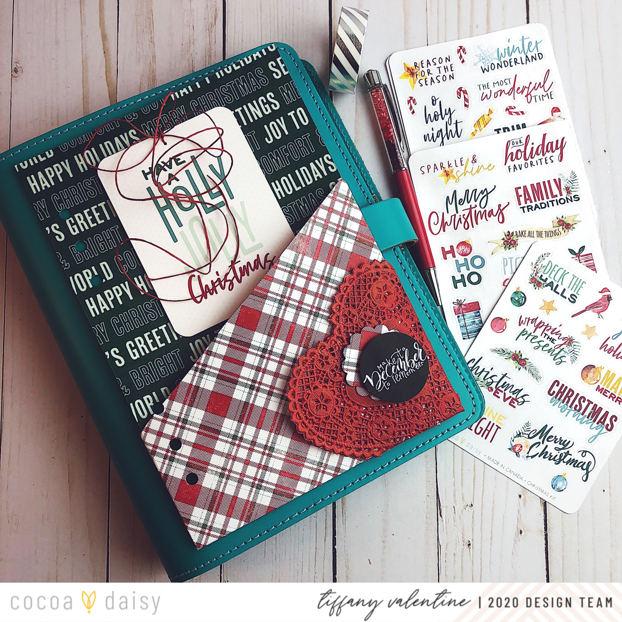 To make the A5 pocket, I used a basic template that I purchased on Etsy. There are many shops to choose from that sell planner templates. I happened to purchase this one and I’m delighted with it: Oks Art Studio A5 template. I added my own touches that you can see in the photo below – – such as the journal card, heart doily, plaid scalloped circle, and “December to remember” die-cut.