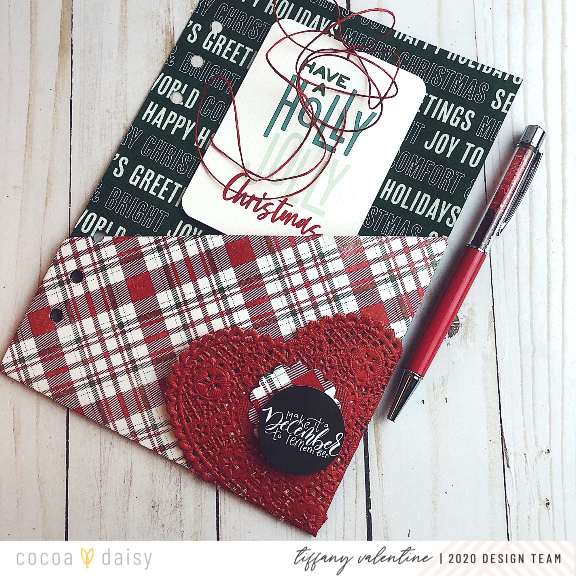 I love choosing papers to use for pockets. I try to choose colors and patterns that are bold and will enhance each other. In this case, I chose the green typography paper. I love the Christmas greetings on it! Once I selected that, I chose the red plaid paper to complement it. Next, I added the white “Holly Jolly” card. I thought it would pop nicely off the dark green background.