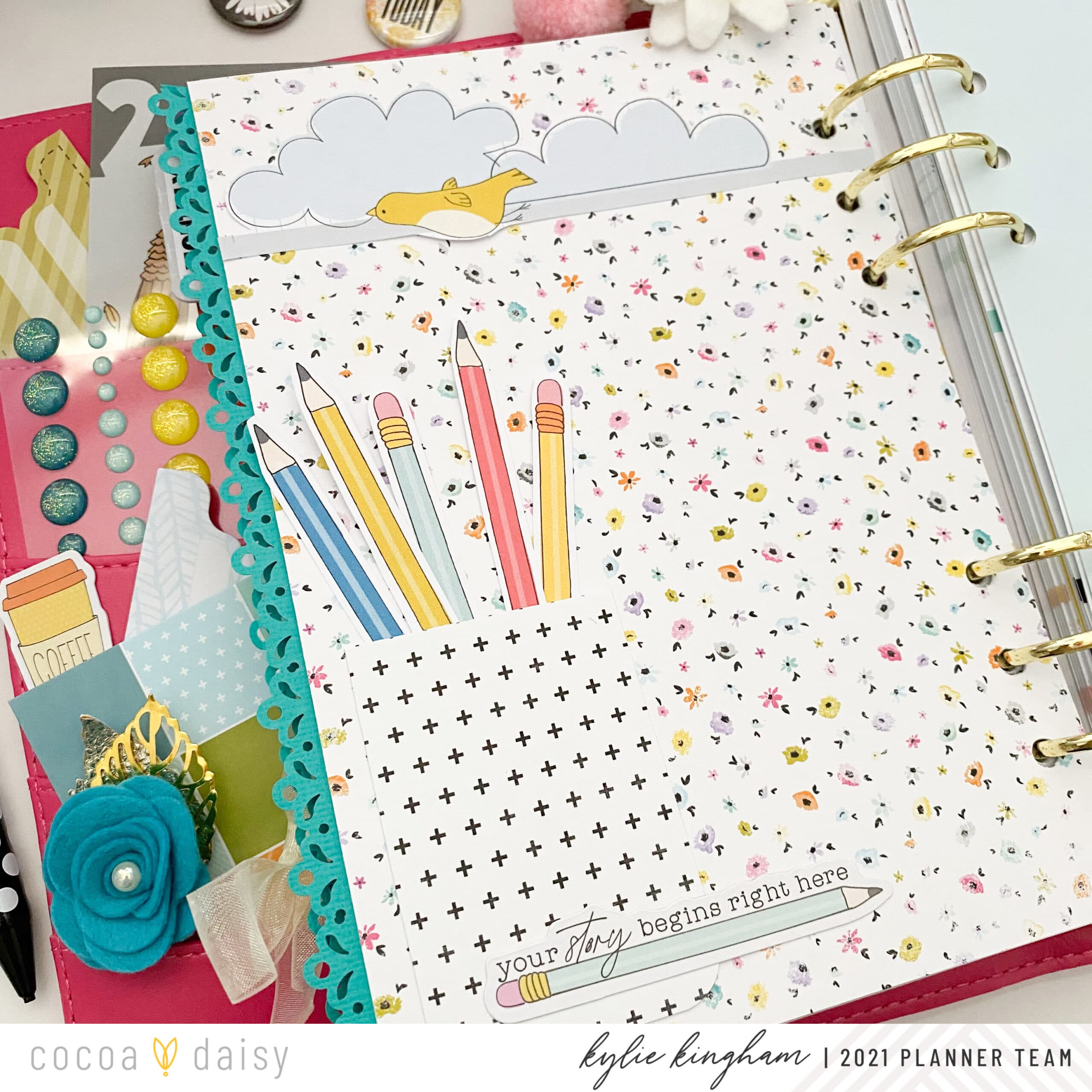 Next up on my list of five are the January printables. I have always been a huge fan of the printables each month. They are a lovely extra addition used with the subscription kits and find not only are they functional but the creative possibilities with them are endless! I’ve used some of the pencils to create a pencil tin pocket on the back of a divider. I also fussy cut out the cloud and bird border to add to the background.