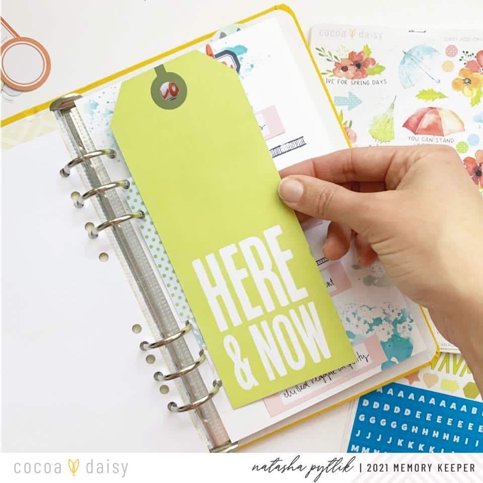 Along with the journal cards I decided to use the bright green tag from the Poppy Fields Traveler’s Notebook Memory Keeping Kitthat says “here and now.” These oversized tags work so beautifully punched and pop right into your album! I love the look of the different size elements in my albums and memory planners- I think it makes the album interactive and more interesting.