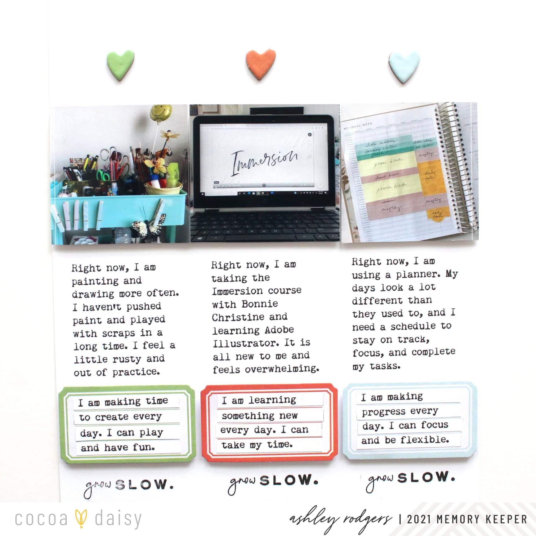 “Hello! I love the stamp set in the Treetop Canopy Modern Memory Keeping Kit. These days I am constantly reminding myself “It’s okay to grow slow”, so I knew I wanted to use that stamp as a prompt for this project. I kept it simple with a grid-style layout and highlighted three areas of my life where this gentle reminder is much needed.
