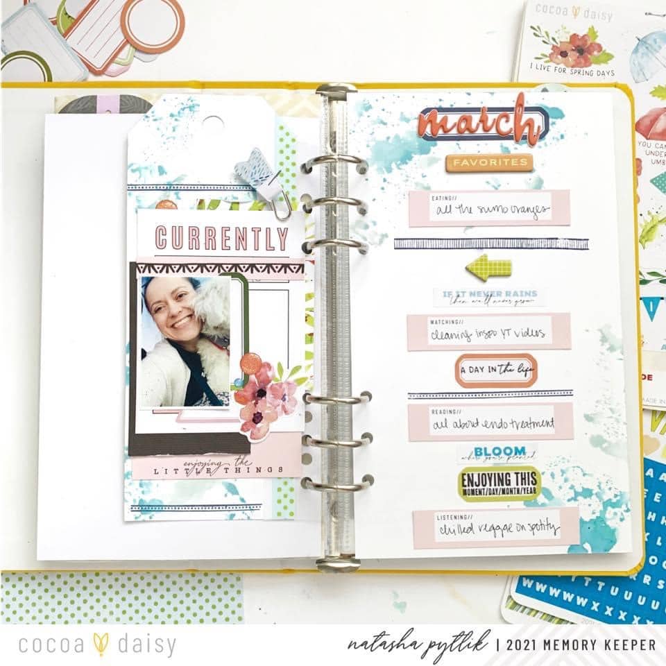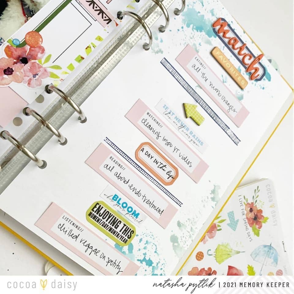 Using the journal cards, even if you are not a pocket page scrapbooker is a great way to help jump-start documenting your monthly favorites. I hope you feel inspired to look at your journal cards in a different way to keep things unique yet approachable on your next project.” There are so many great prompts on the pocket cards and we love how Natasha adapted them to work in her layout.