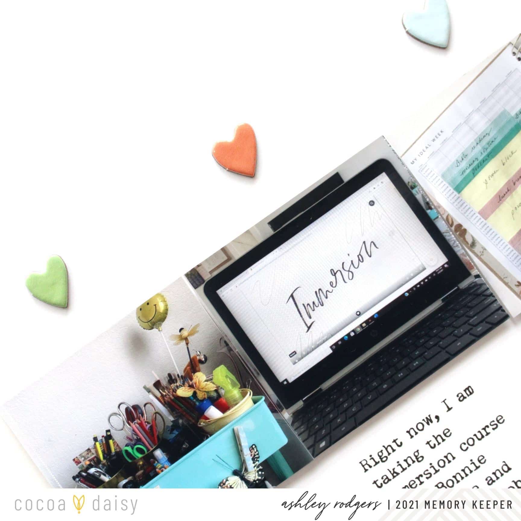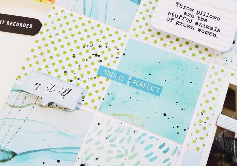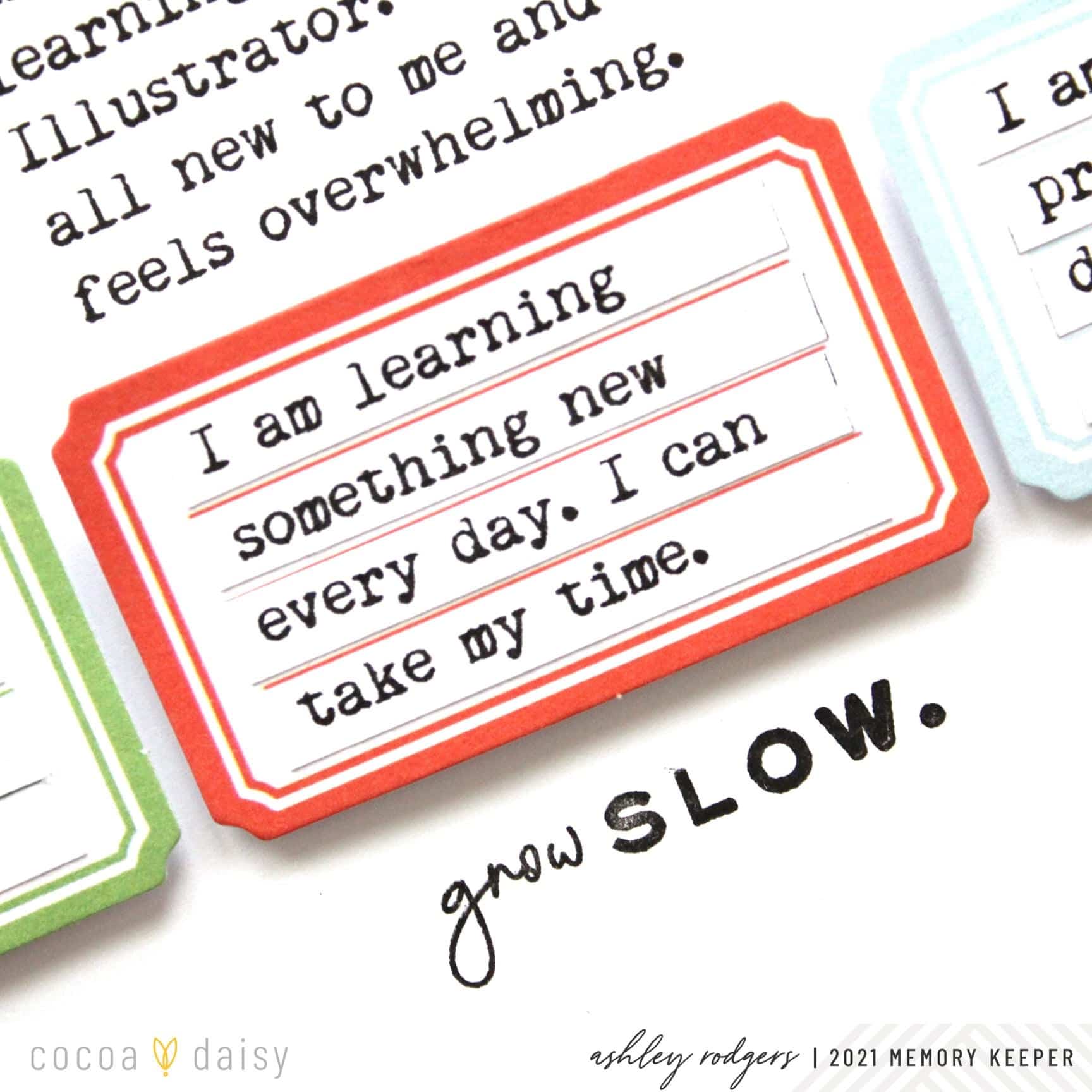 Then, I added a chipboard heart above each photo. I love the way the colors perfectly match the labels. Finally, I inked half the sentiment and stamped it underneath each label. This element of repetition completes the page and makes the whole layout feel cohesive. I hope you feel inspired and remember slow progress is still progress. Happy creating!” We love how Ashley adapted the phrase on the stamp to work for her.