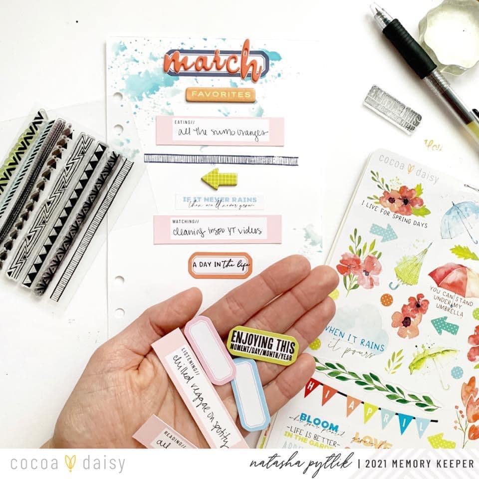 With these prompt strips, I created a vertical pattern down the center of my page by using other horizontal elements (sticker word strips, March’s stamp set, and chipboard from the Treetop Canopy Traveler’s Notebook Memory Keeping Kit) sandwiched throughout my journal card strips.