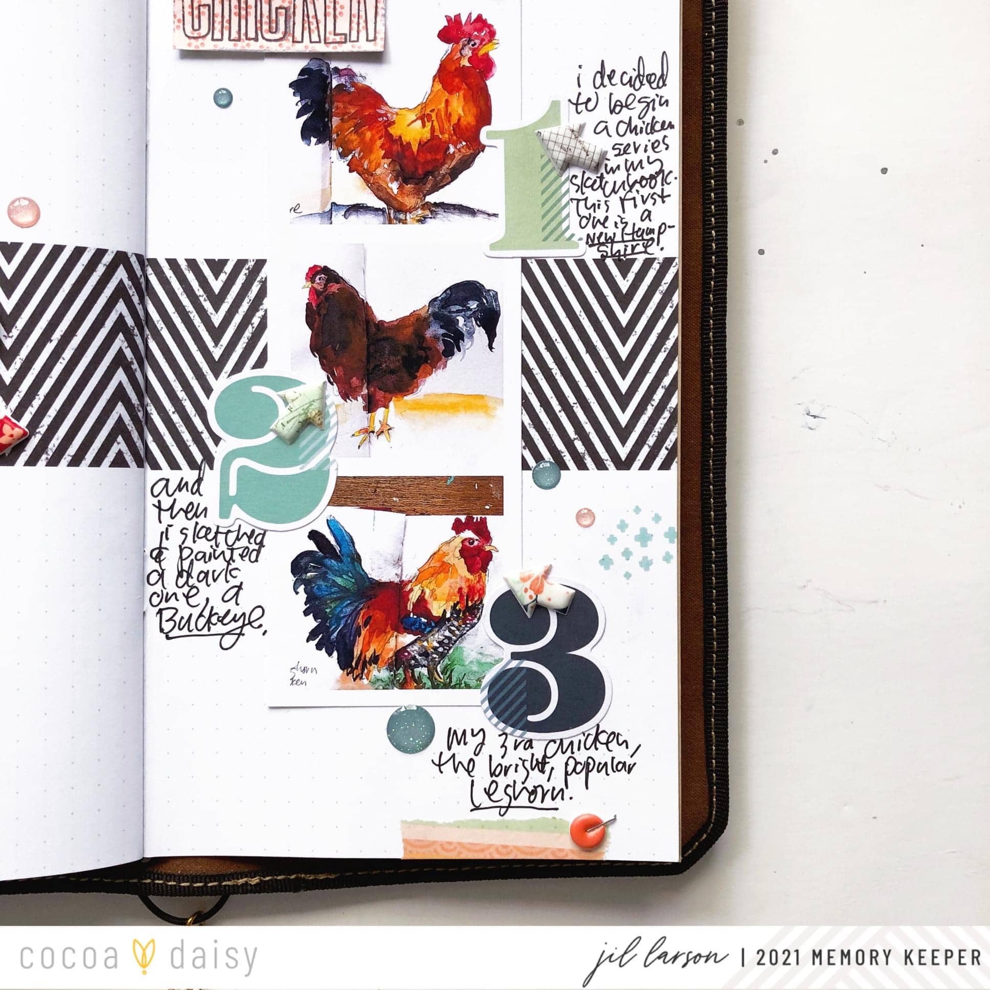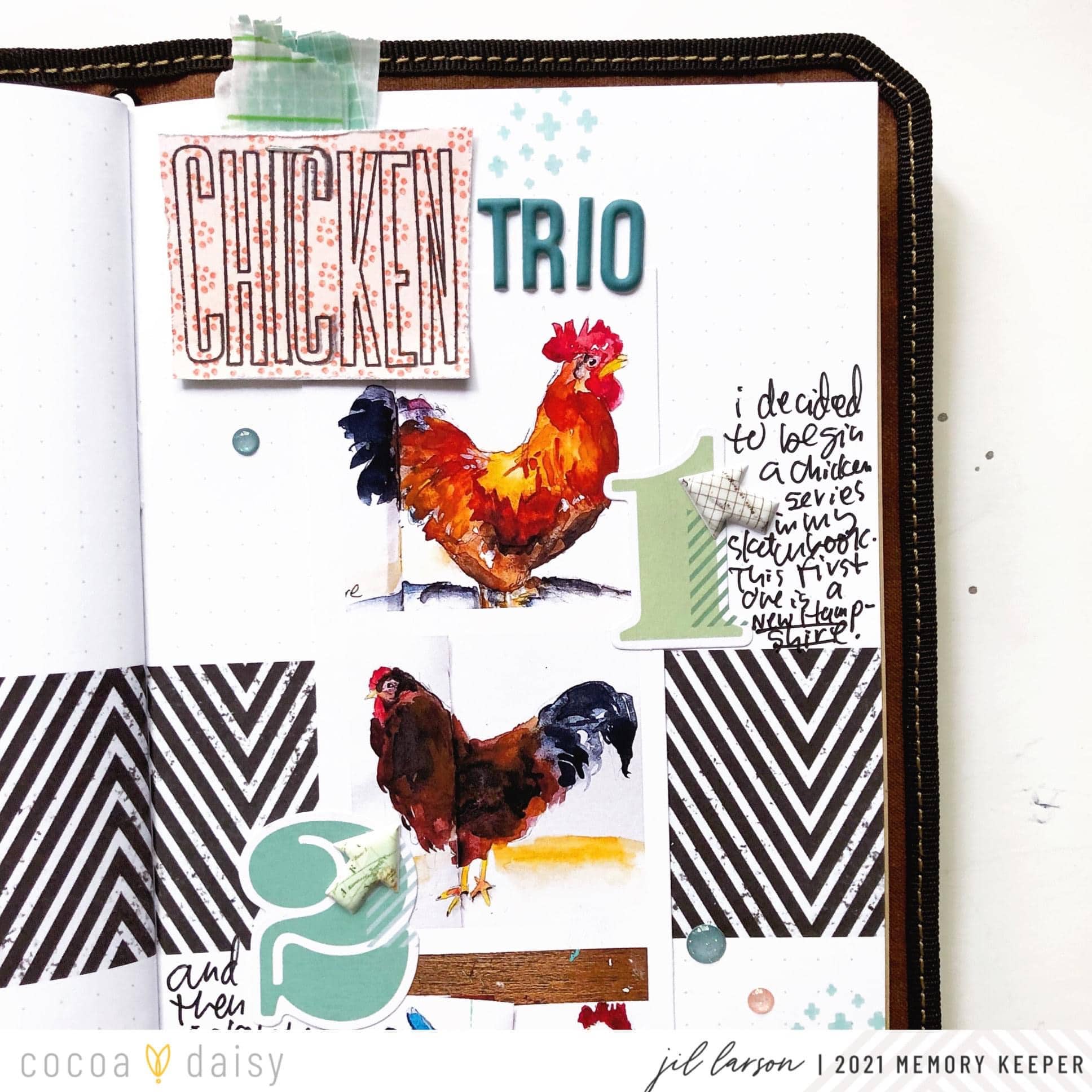 love the black and white chevron design across the middle of the page. I made a photo strip of my watercolor sketches of chickens to run perpendicular to the black and white pattern on the page.