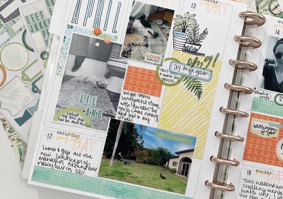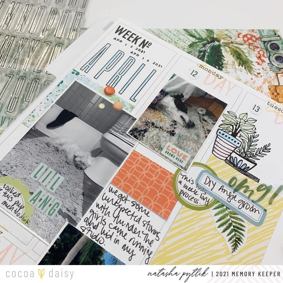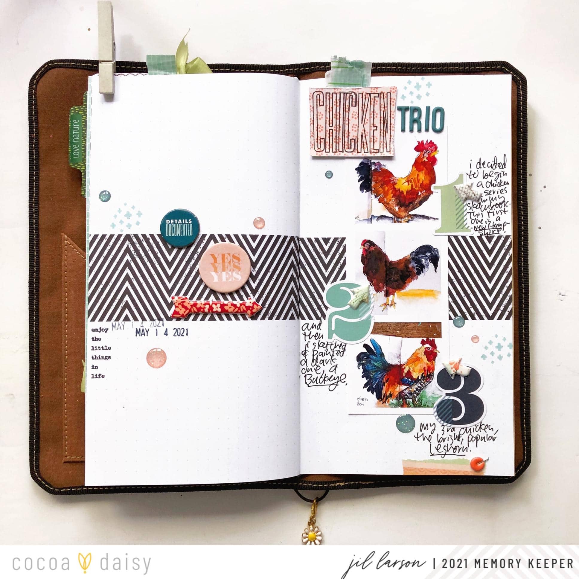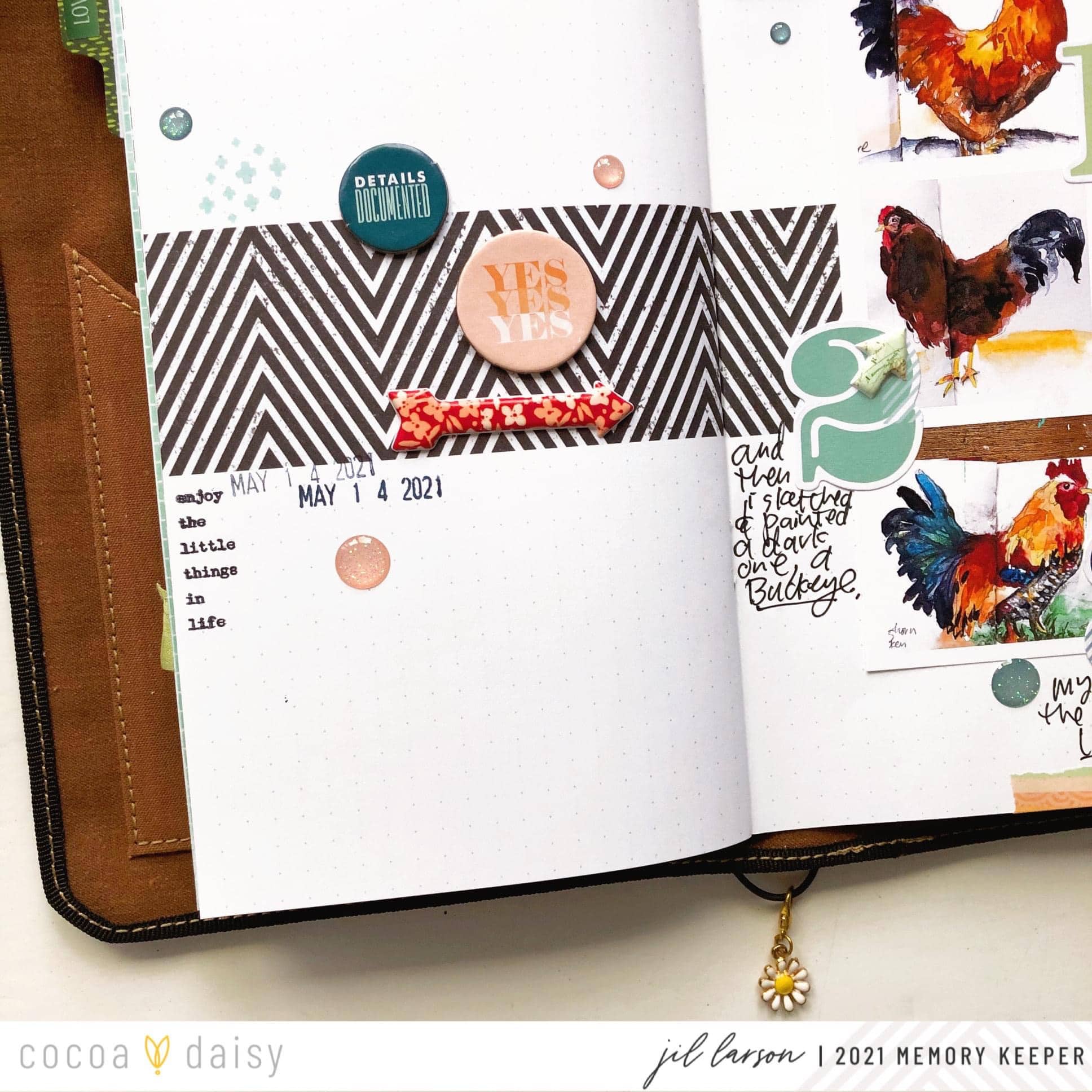 I used the number die cuts, alpha stamps, glitter dots, and puffy arrows from My Escape Travelers Notebook Memory Keeping Kit, but included a little washi from prior kits as well as leftover chipboard that fit my theme (a yes! for each chicken), and the Tranquility Memory Keeping Stamp Set including the stamp reminding us to enjoy the little things in life, which is what this page is all about!