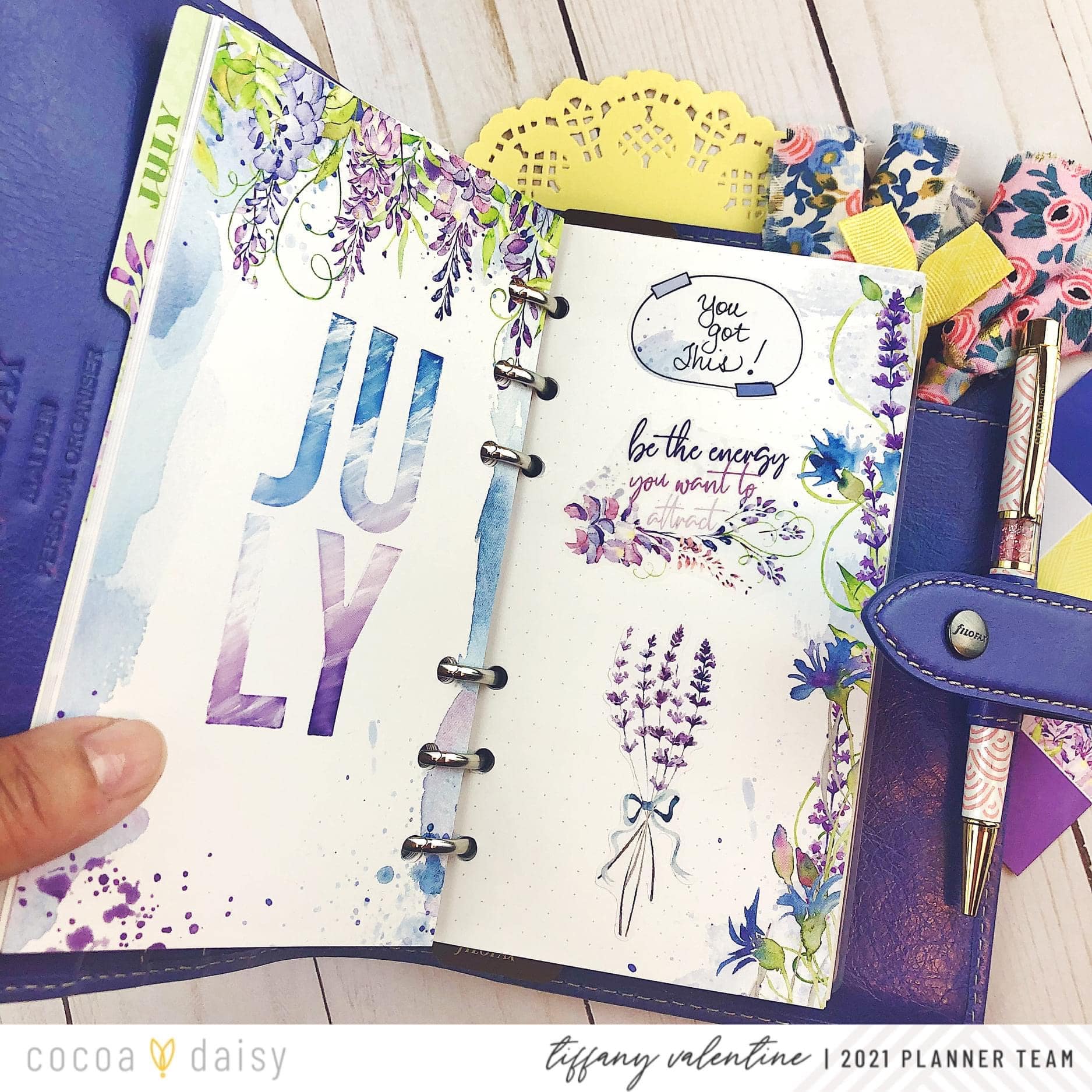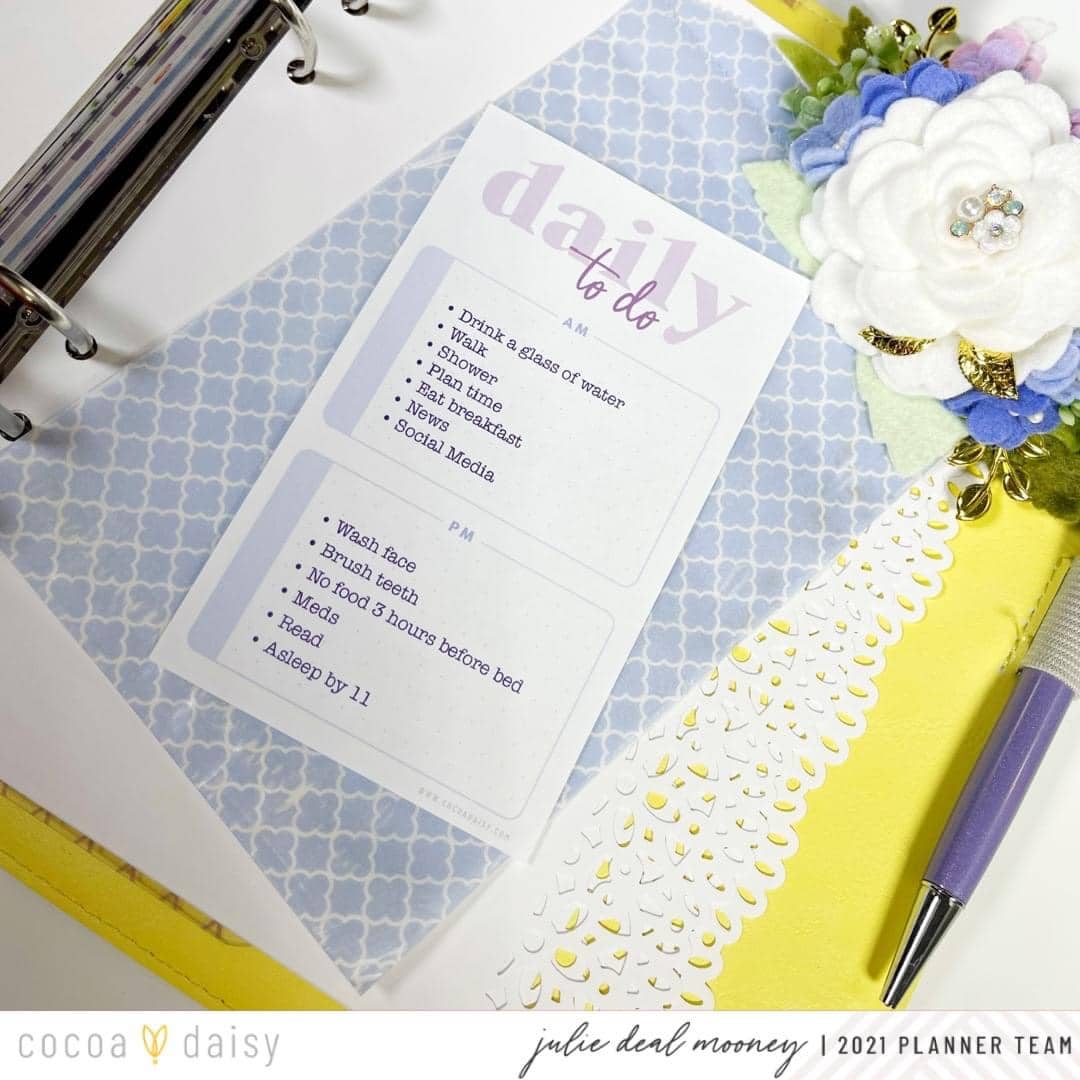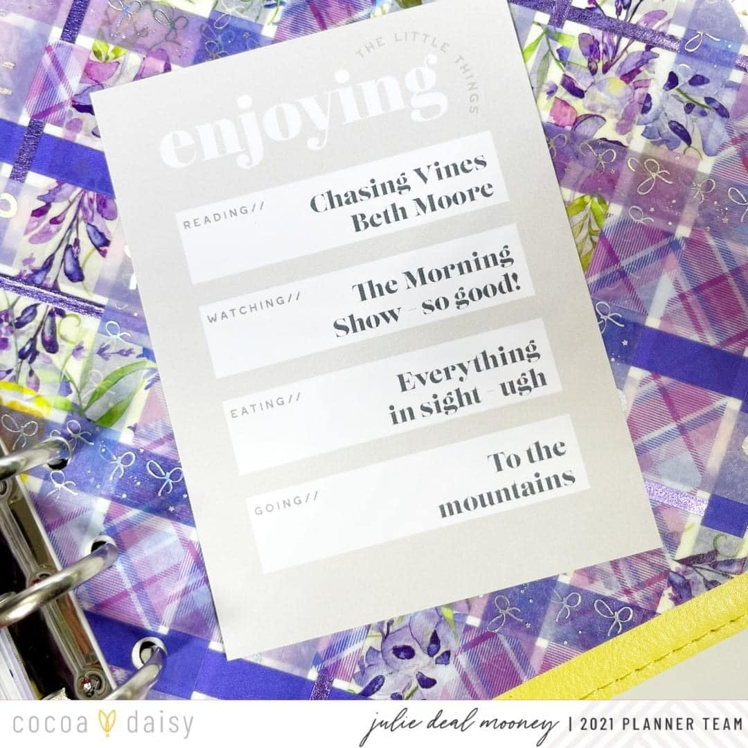 In my process video on my YouTube Channel, I decorate & show how I use dashboards in my personal size planner. One of my favorite ways to use them is as section dividers. I’ve decorated the page next to the dashboard with matching stickers from the Wisteria Lane Daisy Add-On Sticker Kit.