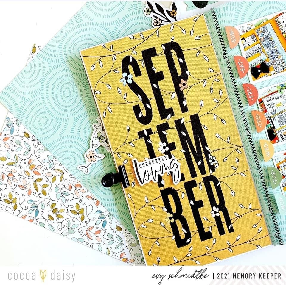 “One (of the1000) things I love about Cocoa Daisy is the ability to use kits from different months together. In particular September and August of this year are just fabulous together and I enjoyed mixing them together in this project. I decided to combine one of the cards from the Doodles and Dashes Traveler’s Notebook Memory Keeping Kit with a Doodles and Dashes Simple Dori pattern to celebrate my return to the planner world and to use the diecuts and stamp of the Peach Ridge Collection that I hadn’t been able to use as I wanted.