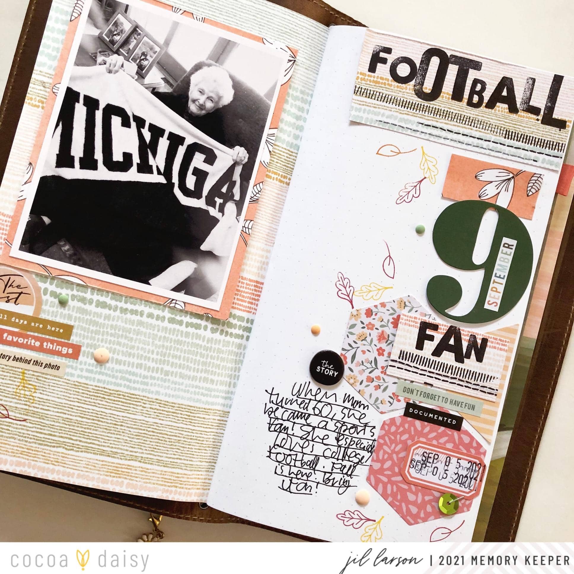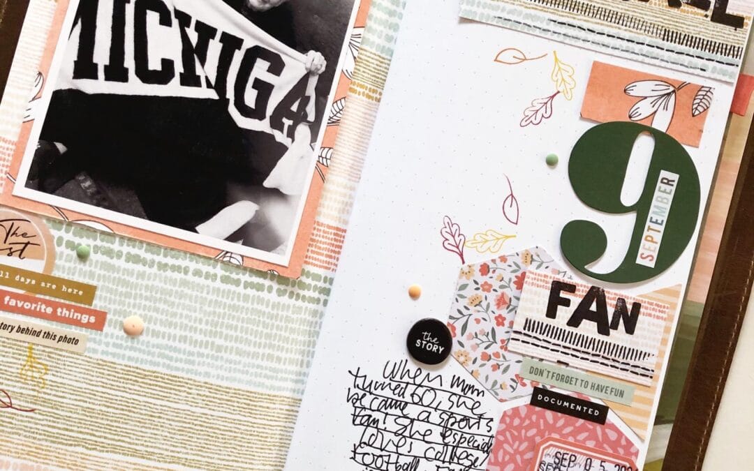 September marks the start of college football games on television for her, and so I used a September sticker on top of a big 9 from my stash (to evoke a number on a jersey and to balance out the graphic on my mom’s blanket in the photo).