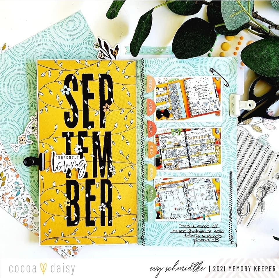 The right page instead contains the first photos of my September planner and I found the perfect match with these diecuts from the Peach Ridge Modern Memory Keeping Kit with the various days of the week! To give a little contrast, I added some stamps and the last clear stitch stickers from the Wisteria Lane Classified: Memory Keeping Kit. Don’t you find the combination of the clear stickers with the August stamp fabulous?”