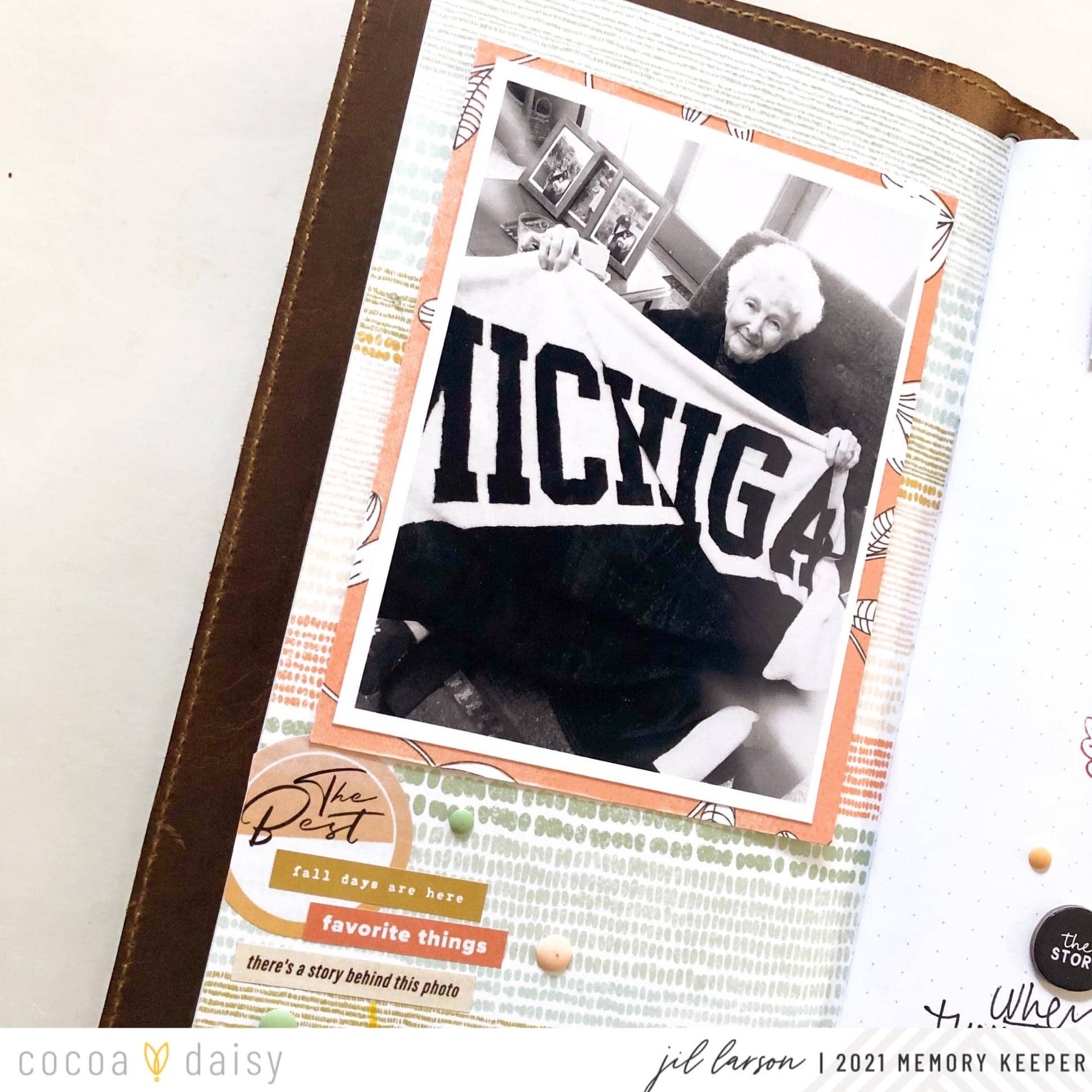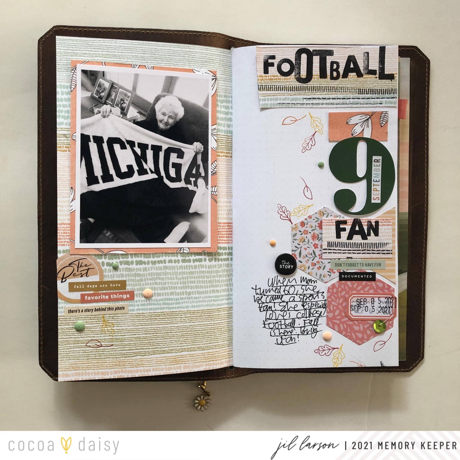 “As much as I love Doodles & Dashes Collection, there were elements from Peach Ridge Collection that I did not want to leave behind. Working in the Doodles and Dashes Simple Dori, I used the hexagon pieces from last month’s kit, along with the stitch stamp set from the Peach Ridge Travelers Notebook Memory Keeping Kit, to tell this story about my mom, the sports fan.