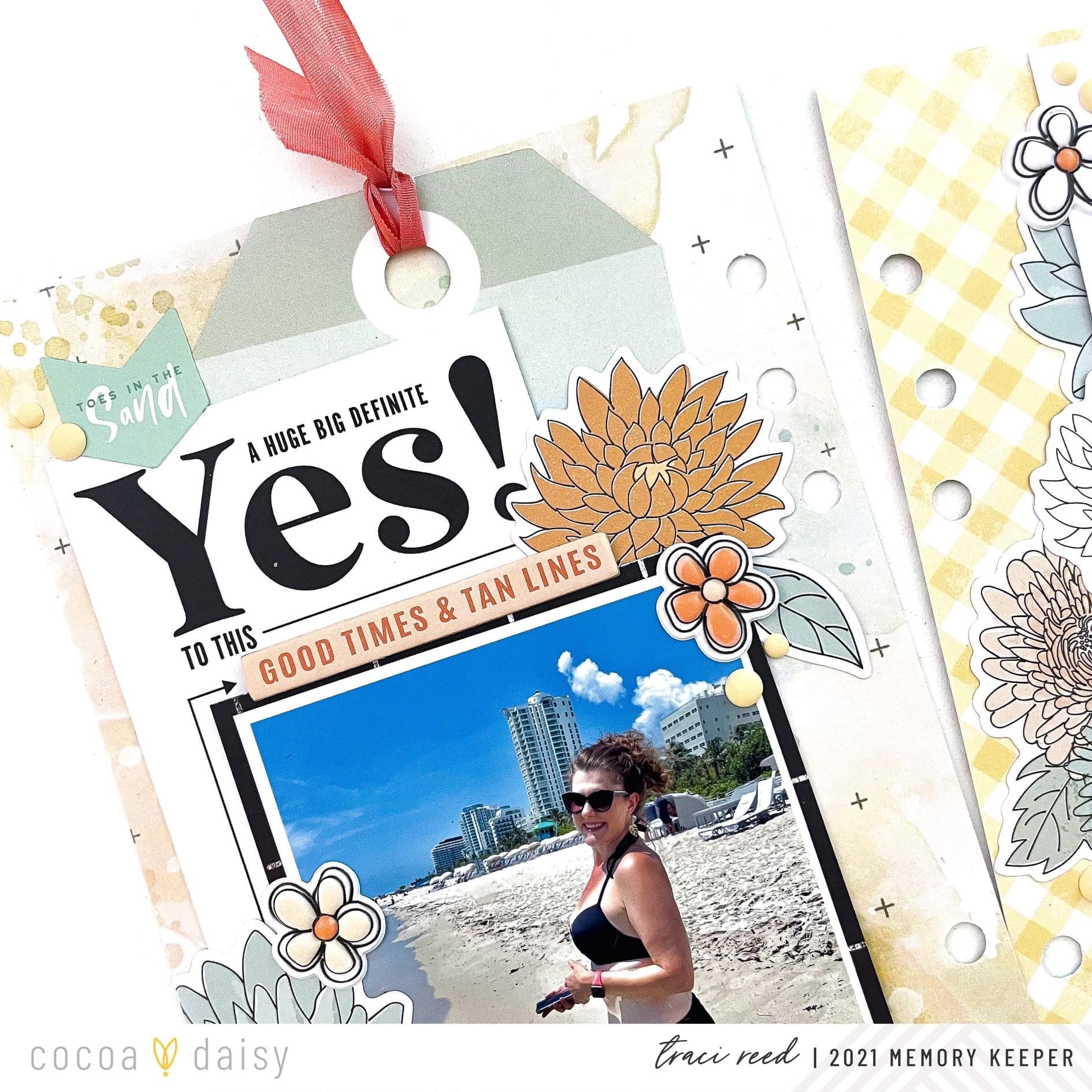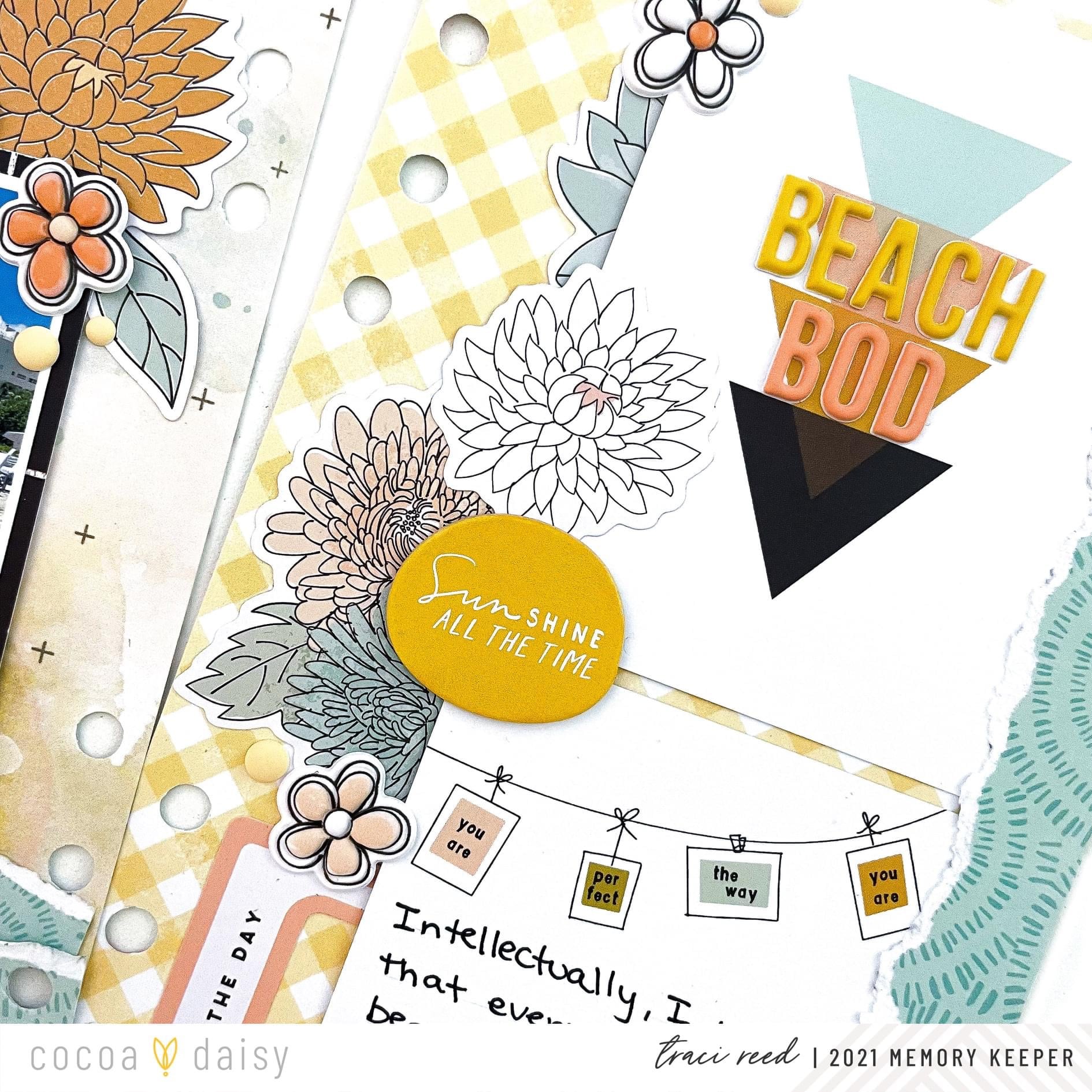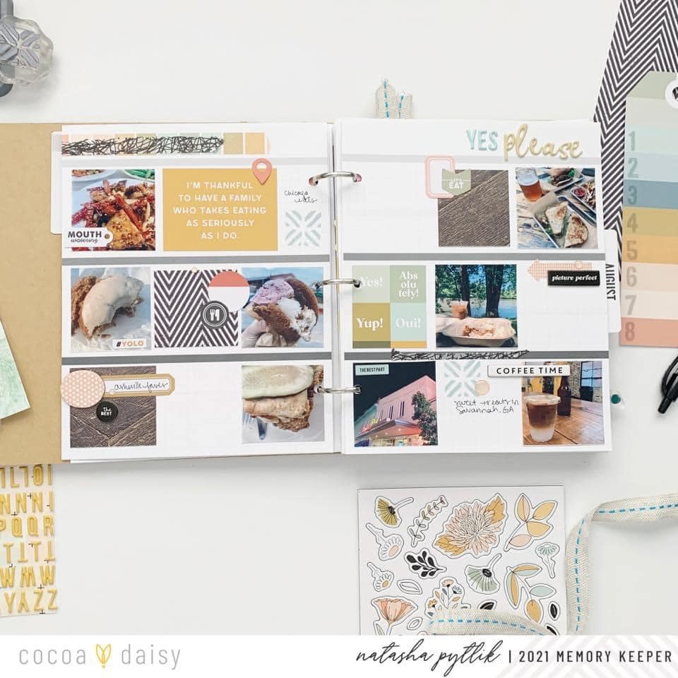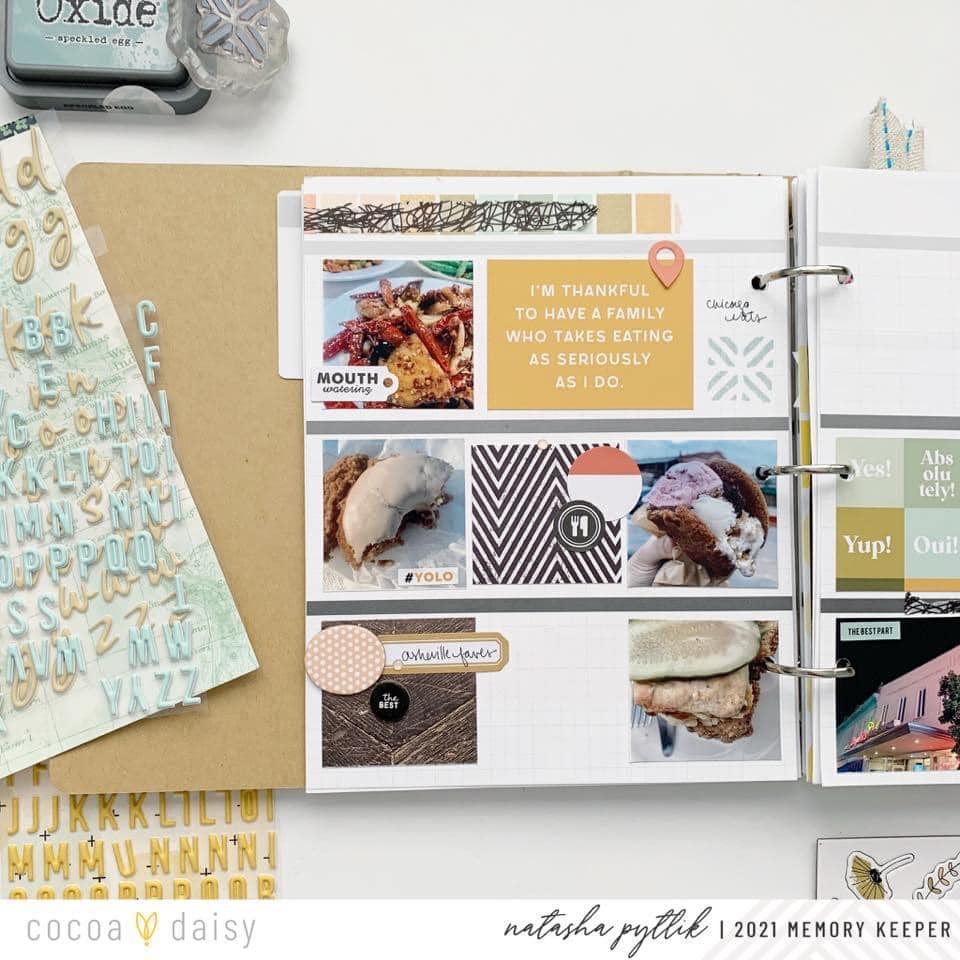“As a paper crafter who is often driven by color, I’m always so impressed with how well the Cocoa Daisy collections mix and match throughout the years. I find the way I store my previous kit materials allows me to go back and find coordinating items that will work out with a specific layout. I keep certain items stored together such as enamel dots, alphas, and washi tape. Storing my kit materials in this way makes it really easy to pull out a variety of colors of items to find which product is the best match for the overall look I’m going for.