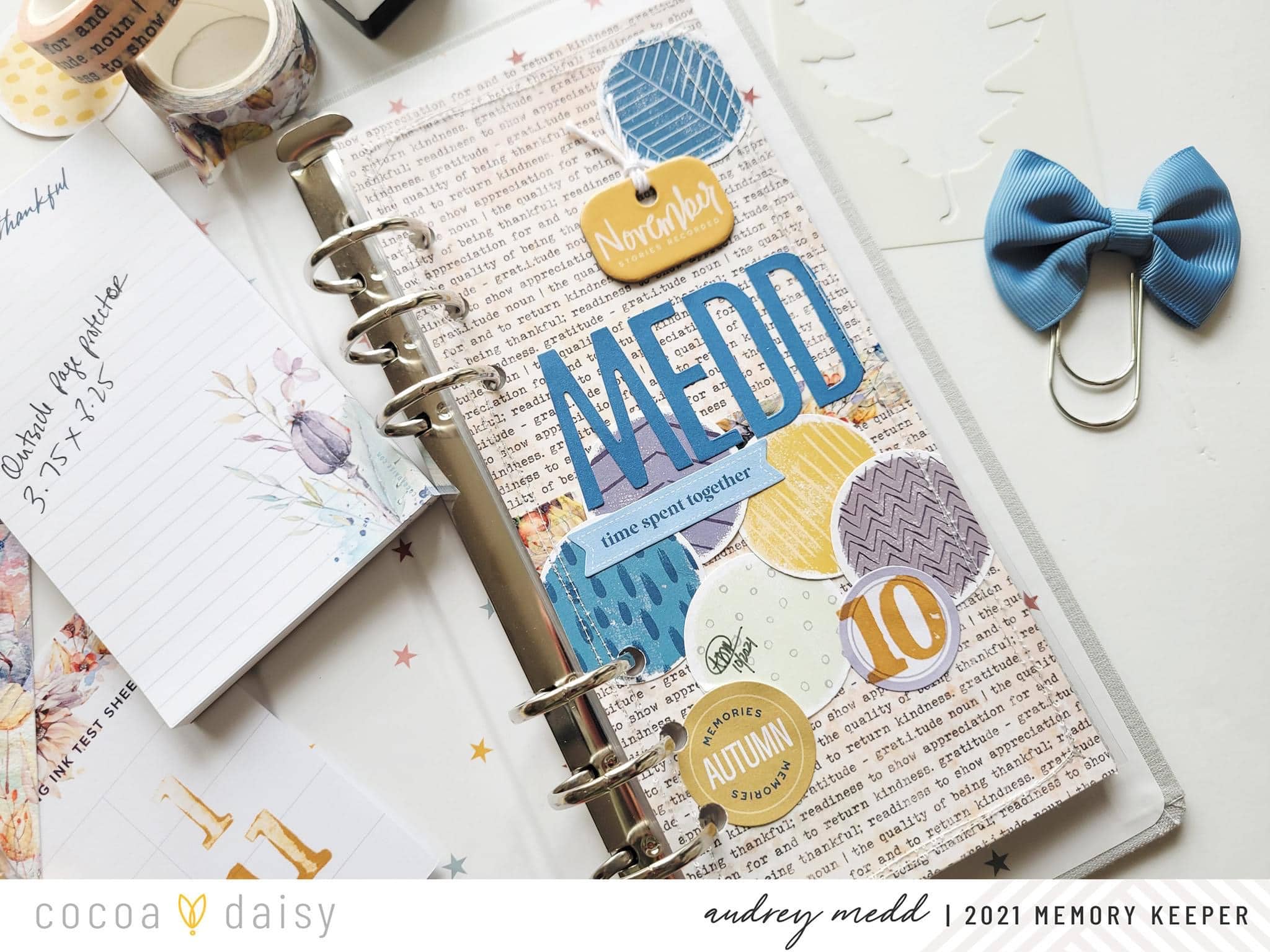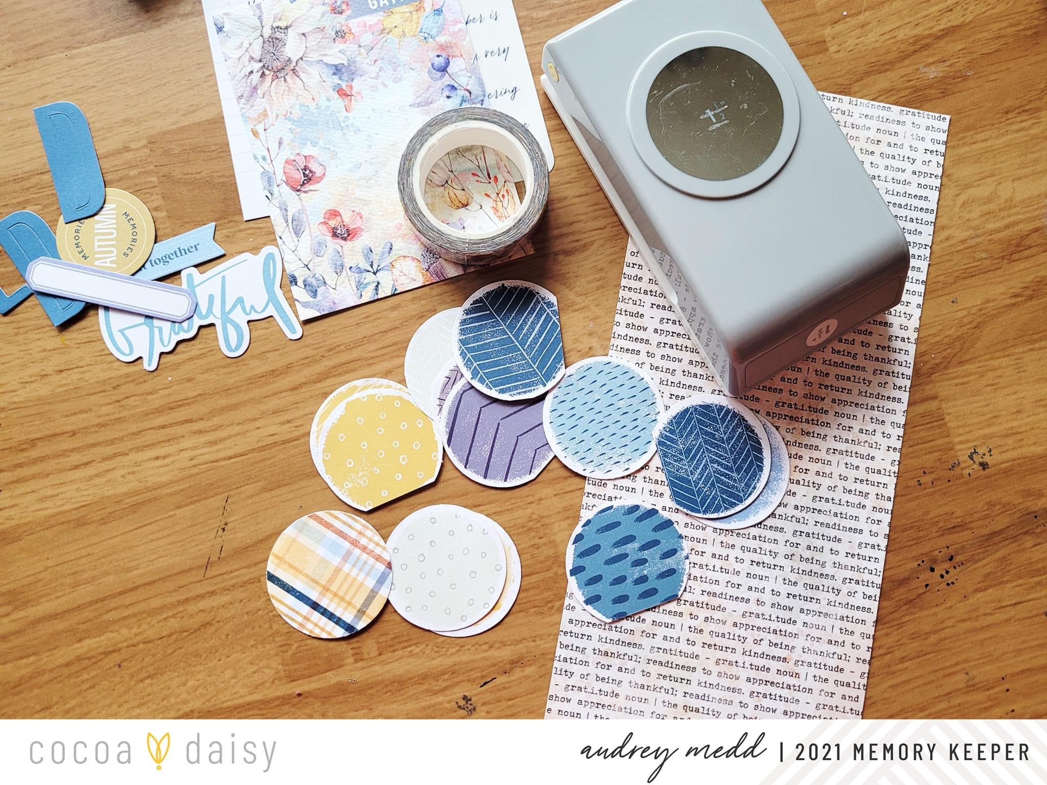 I am using a 3×8 album so I started by cutting down one of the Gather Memory Keeping Kit Papers. I then punched the circles out of the paper circle to make a pattern. After, I used some of the alpha stickers from the Gather Classified: Memory Keeping Kit to spell out my last name.