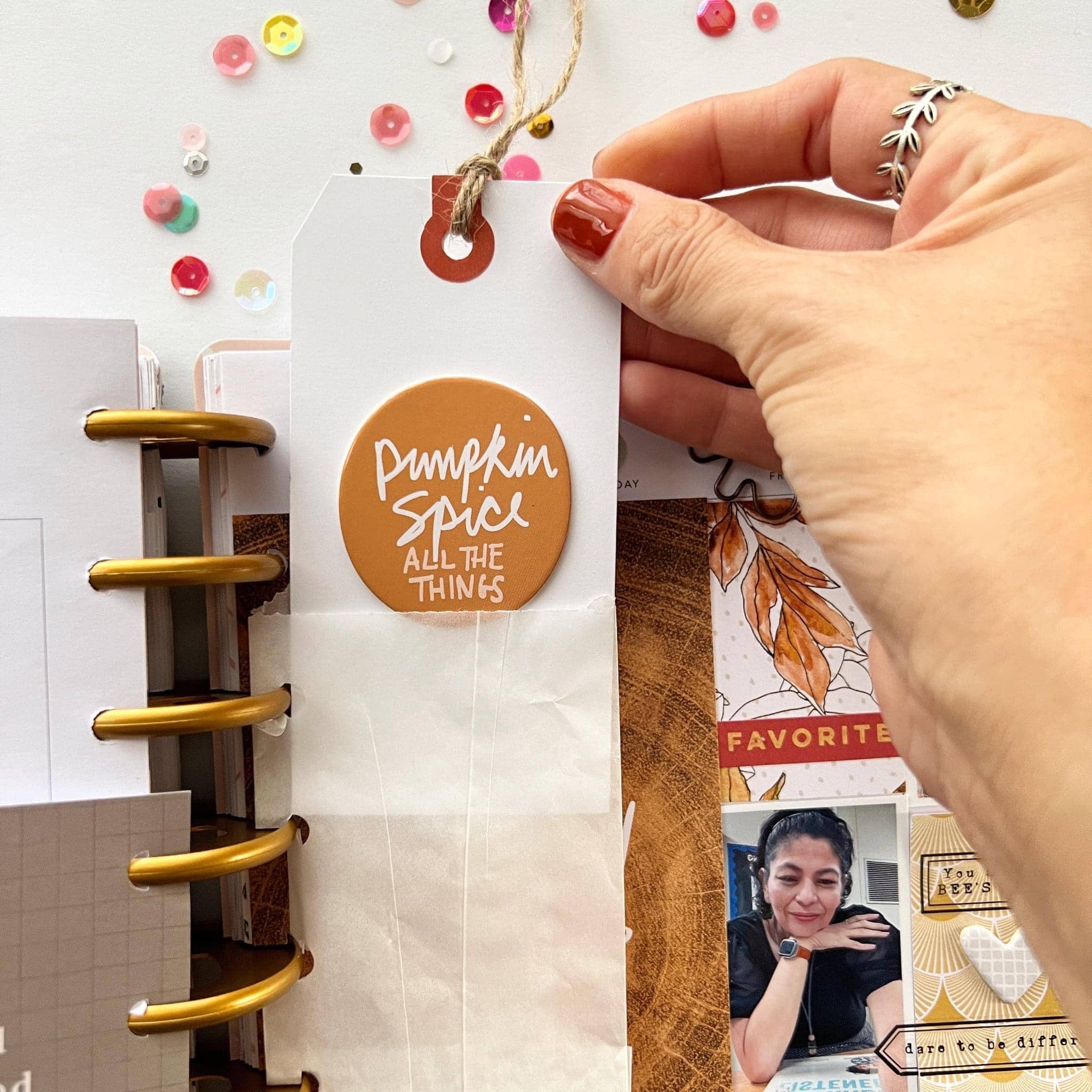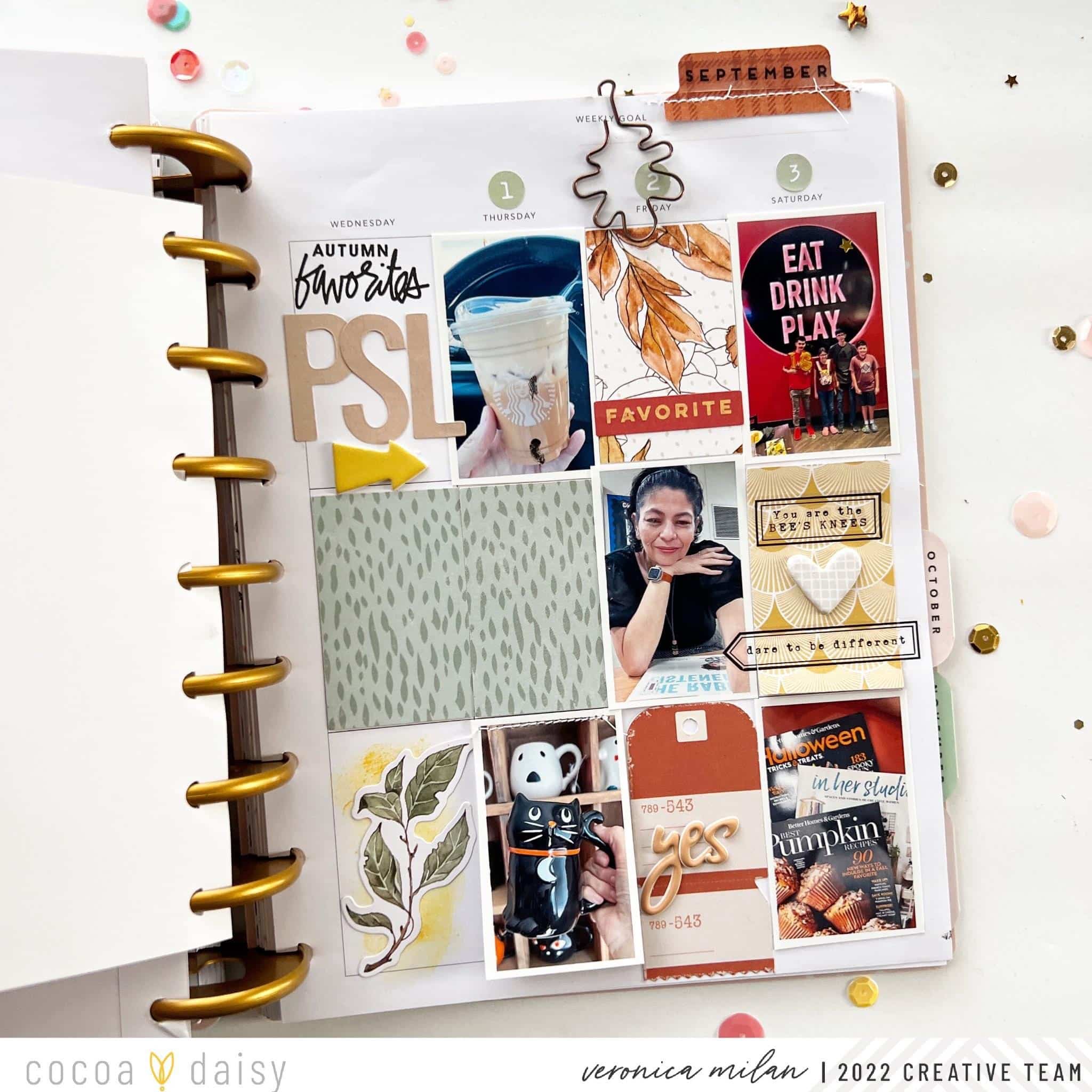 I stamped in black ink “Autumn favorites” because Pumpkin Spice Lattes are my fav! I loved using all the bits of tags, rub-ons, and alpha to this page and then topped it with a leaf paper clip!