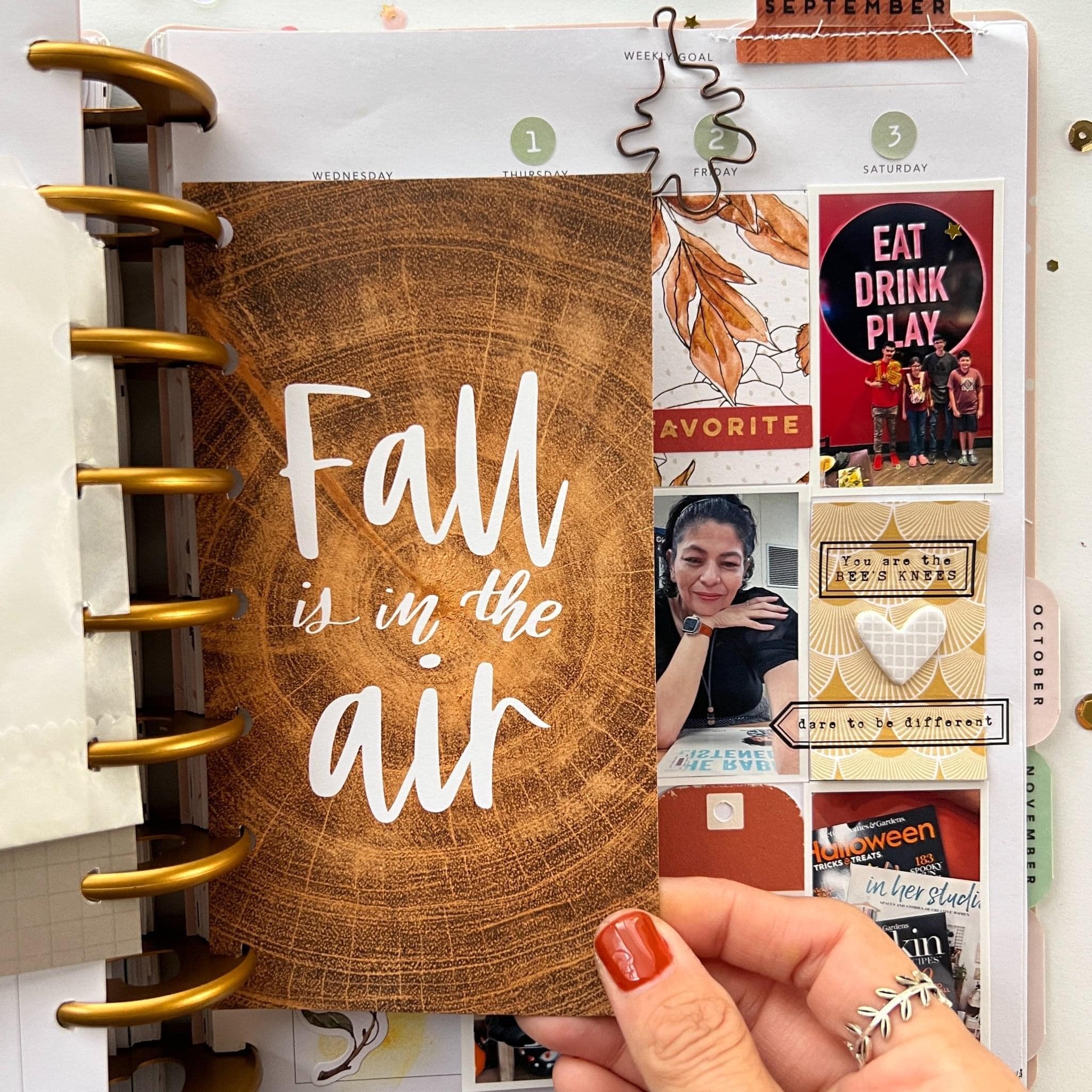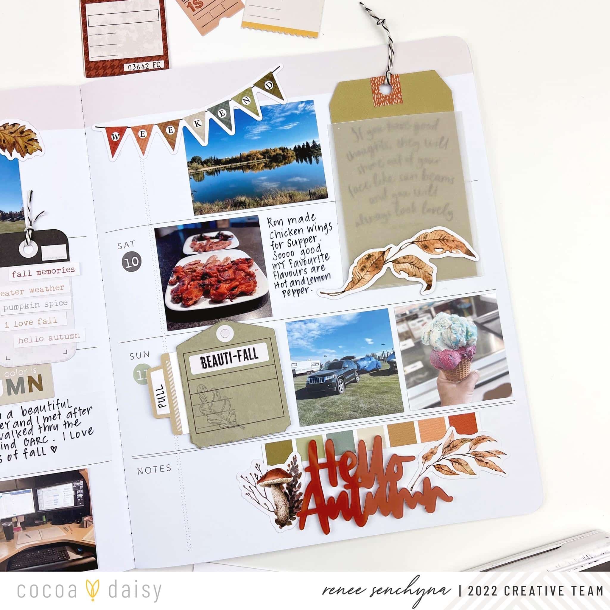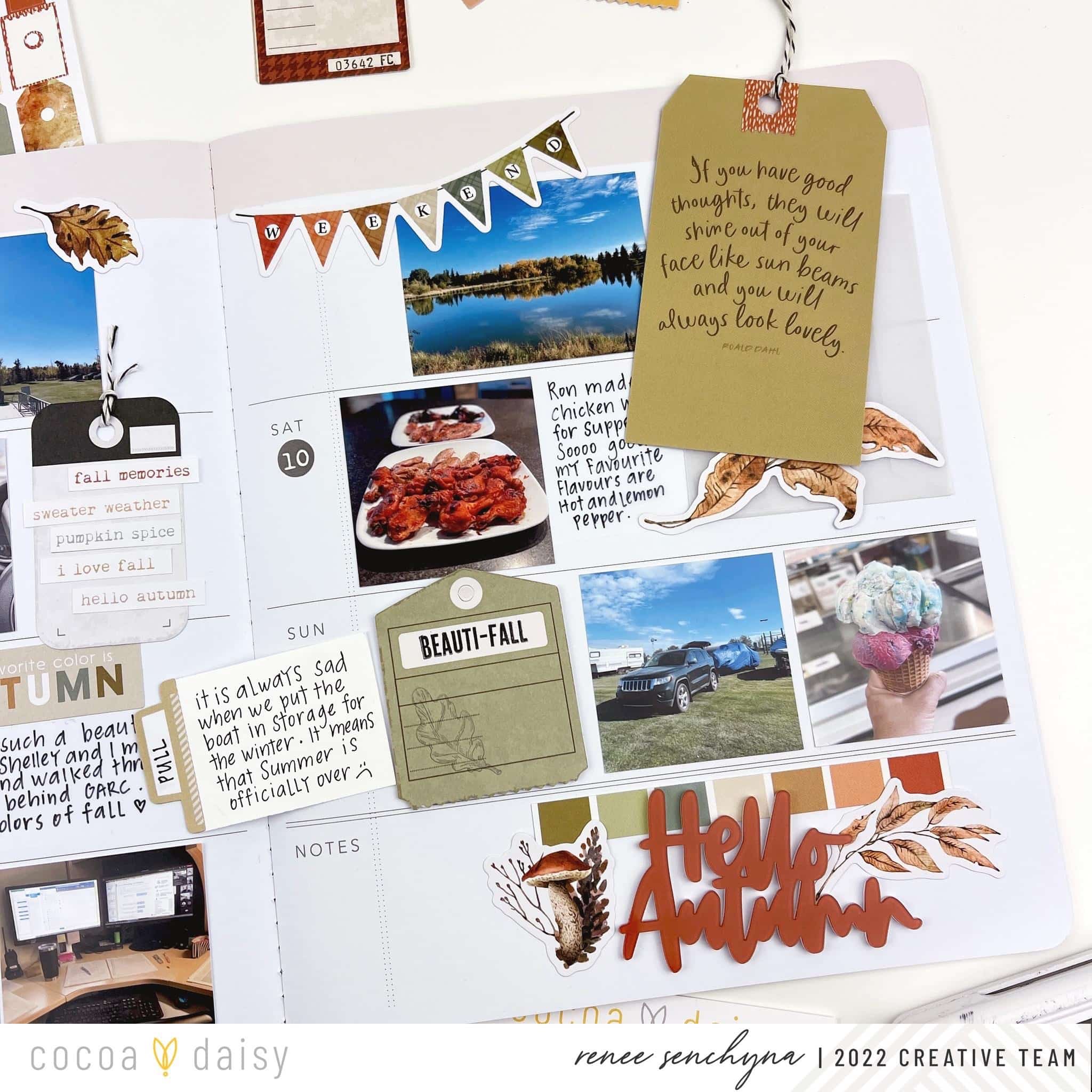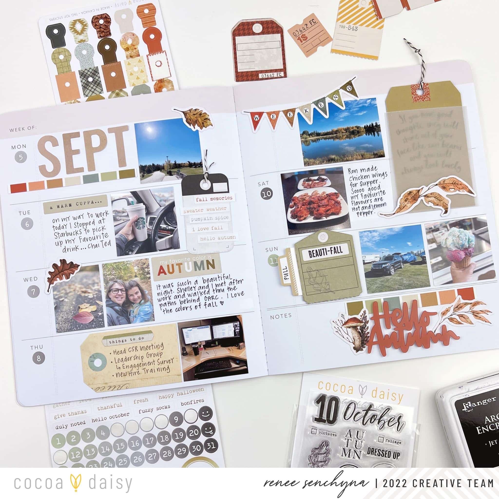 When I create pages in my memory planner I always start with my photos first. I print out the photos I want to use, adhere them to my layout, then go back and add my journaling, stickers, and decorative elements. On this layout, I used the cardstock letter stickers from the Autumn Thicket Classified: Memory Keeping Kit to add the ‘Sept’ title. The cardstock stickers came from the Autumn Thicket Classified: Memory Keeping Kit, the Autumn Thicket Modern Memory Keeping Kit, and the Autumn Thicket Planner Add-on Kit. All of the tags came from the Autumn Thicket Modern Memory Keeping Kit. The date stickers and the fall phrase stickers came from the Autumn Thicket Memory Keeping Sticker Kit.