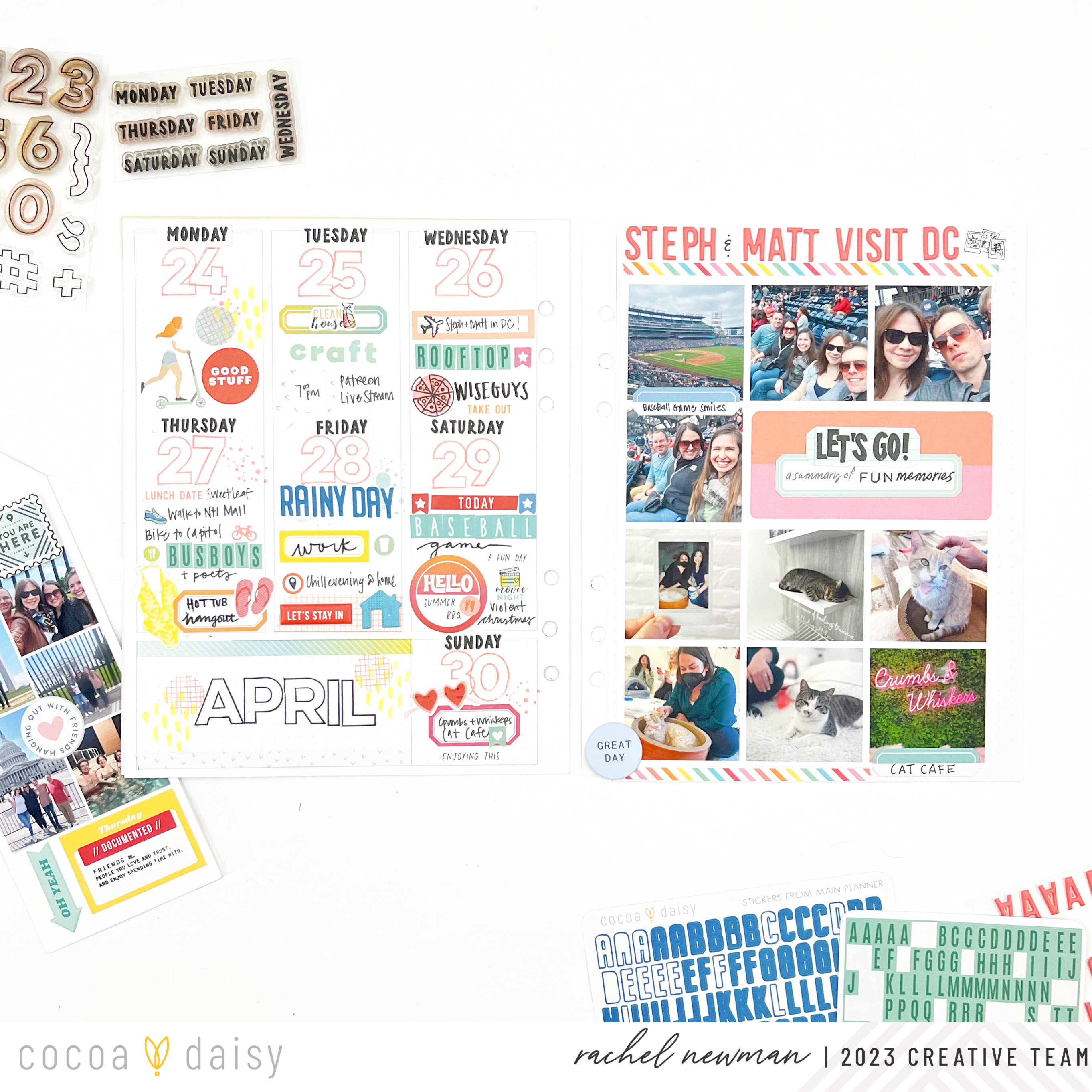 Summer is typically a season where I take a step back from memory planning, so I used this collection to catch up on a few weeks from April. I see three of my favorite items from the collection on this page. First, the days of the week stamp from the Summer Vibes Planner Kit couldn’t be more perfect for switching things up in my Daisy Planner, creating a week-on-one-page design. Second, the number stamp from the Summer Vibes Modern Memory Keeping Kit is a lovely size for this format, don’t you think? Third, the alphas make every layout pop and create more visual interest.