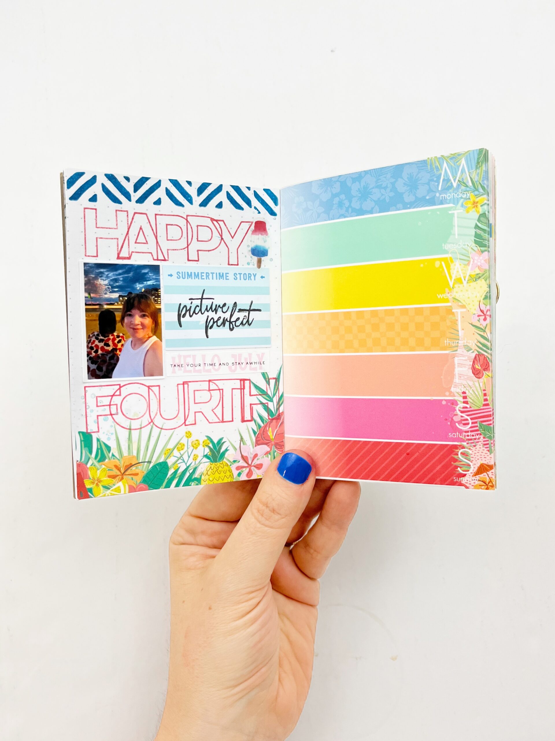 I don’t know what it is about the summer months, but they always have me reaching for smaller notebooks like this cutie. The Summer Vibes Mini Dori (a 3.5 x 5 passport-size notebook) was the perfect notebook to slip inside my passport-size wallet setup. I used the majority of the notebook for personal journaling and morning affirmations but I had the most fun using this notebook for simple spreads like this one. I had 5 minutes of downtime and a pile of die cuts from the Summer Vibes Planner Add-On Kit so I took the opportunity to get creative and I just love how it turned out.