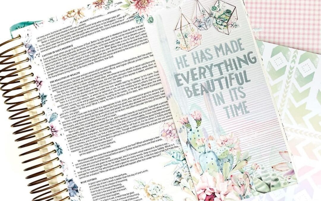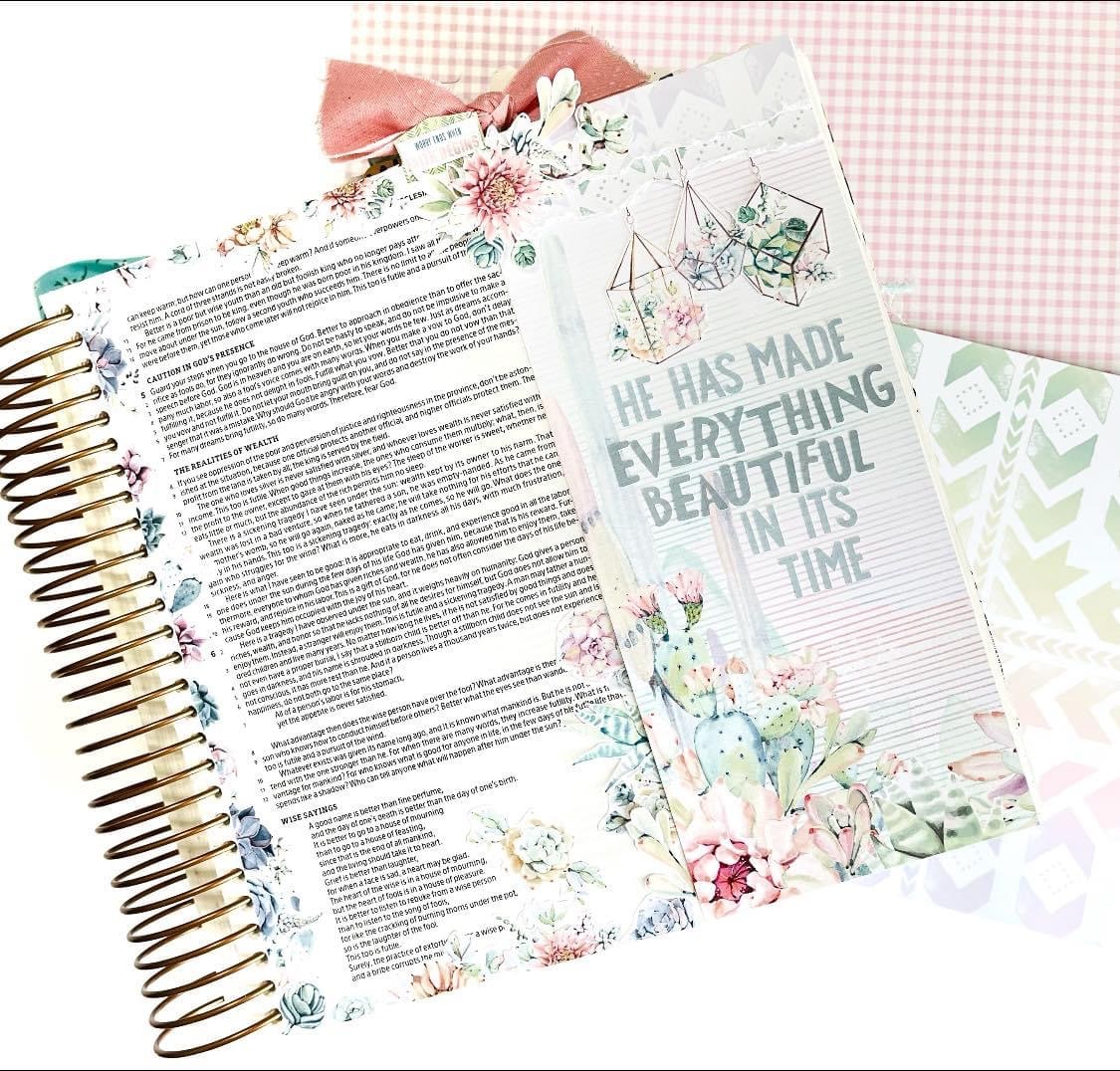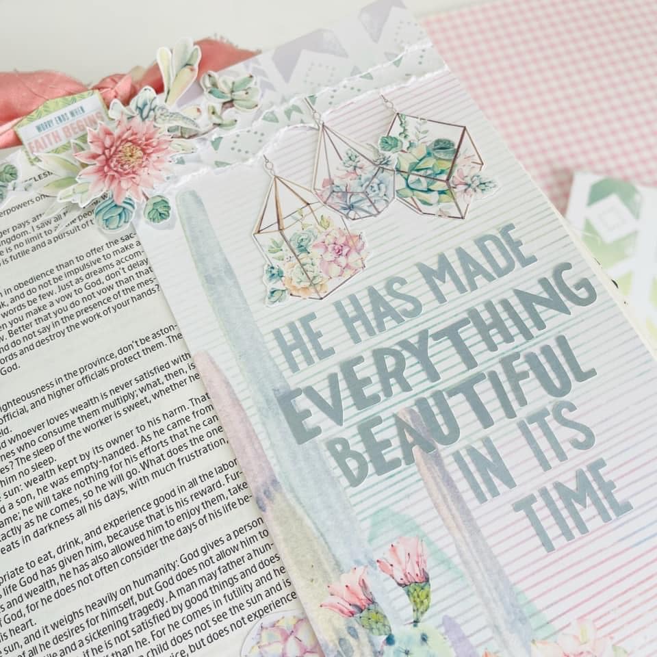 “Currently, I am studying Ecclesiastes and used the Cactus Moon Collection to illuminate my reflection. I am using the large illustrating Bible for this bible page. I used the beautiful card stock from the Cactus Moon Modern Memory Keeping Kit to start to get the incredible idea for this page. Then I fussy cut elements from Cactus Moon Planner Printables the digital version of this month’s kit.