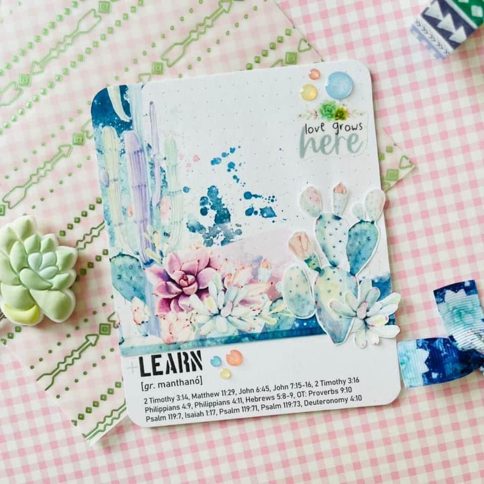 For “Word Study Wednesday”, I used a word focus card from Open Journey. The background was part of the Cactus Moon Planner Printables! The digital download makes it easy to create a background and it’s best to keep things simple when you’re doing a word focus study. The love grows here sticker from the Cactus Moon Bible Journaling Sticker Kit was perfect for this project. And I use the enamel dots from last the Elegance Blooms Collection to add a finishing touch to the card. The Cocoa Daisy Kits are perfect to mix and match each month!