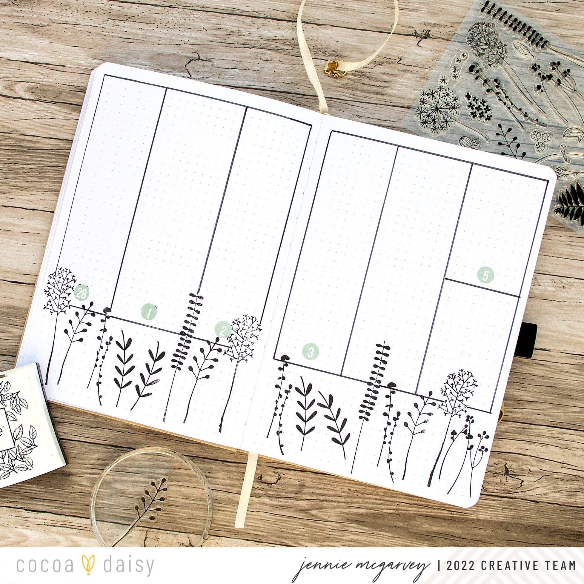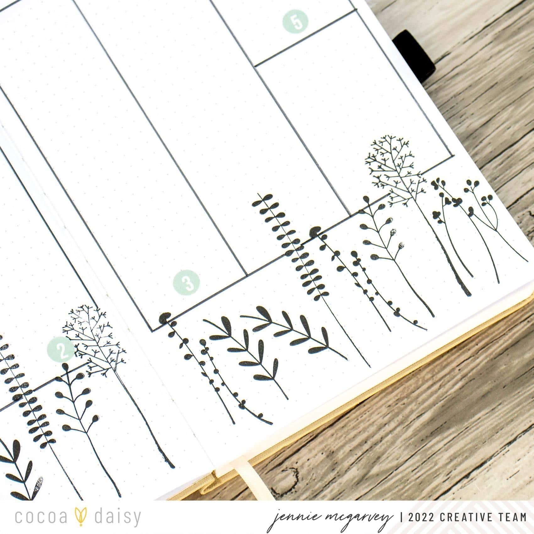 This layout is only my pen, the Whimsical Weeds Stamp Set, and some random number stickers from my stash. See how this spread came together in the video below.