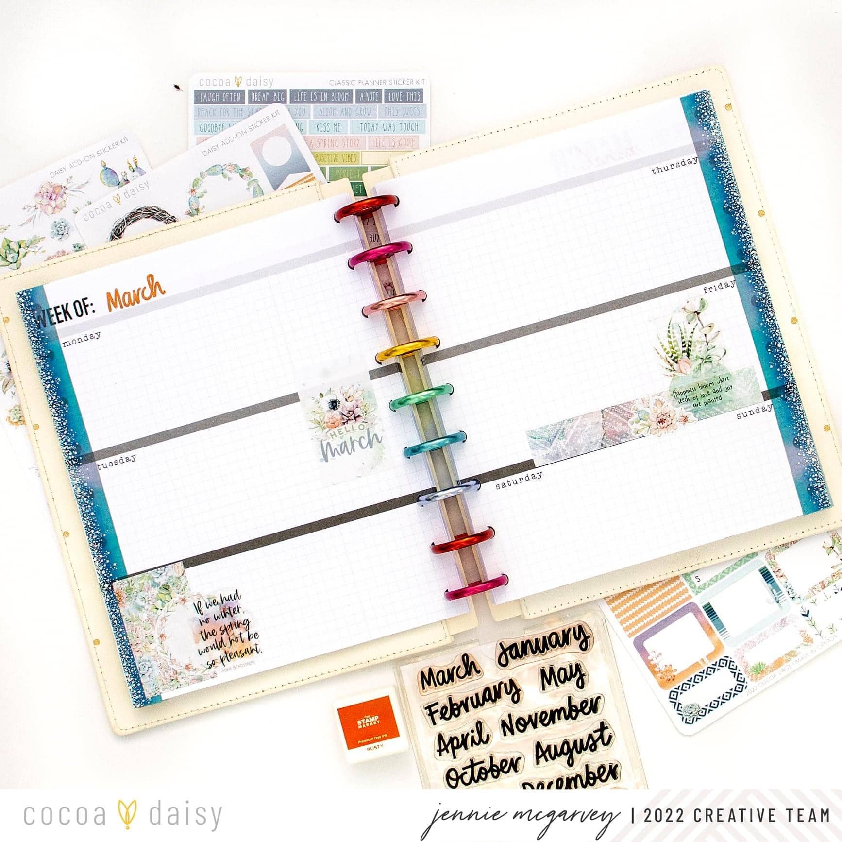 I kept these two weeks quite simple, focusing heavily on the visual triangle and layering stickers in both designs. That is so easy to do with Cocoa Daisy stickers, particularly these stickers from the Cactus Moon Classic Sticker Kit as they are so varied and very easy to use. Join me as I lay the foundation for this spread in the video below.”
