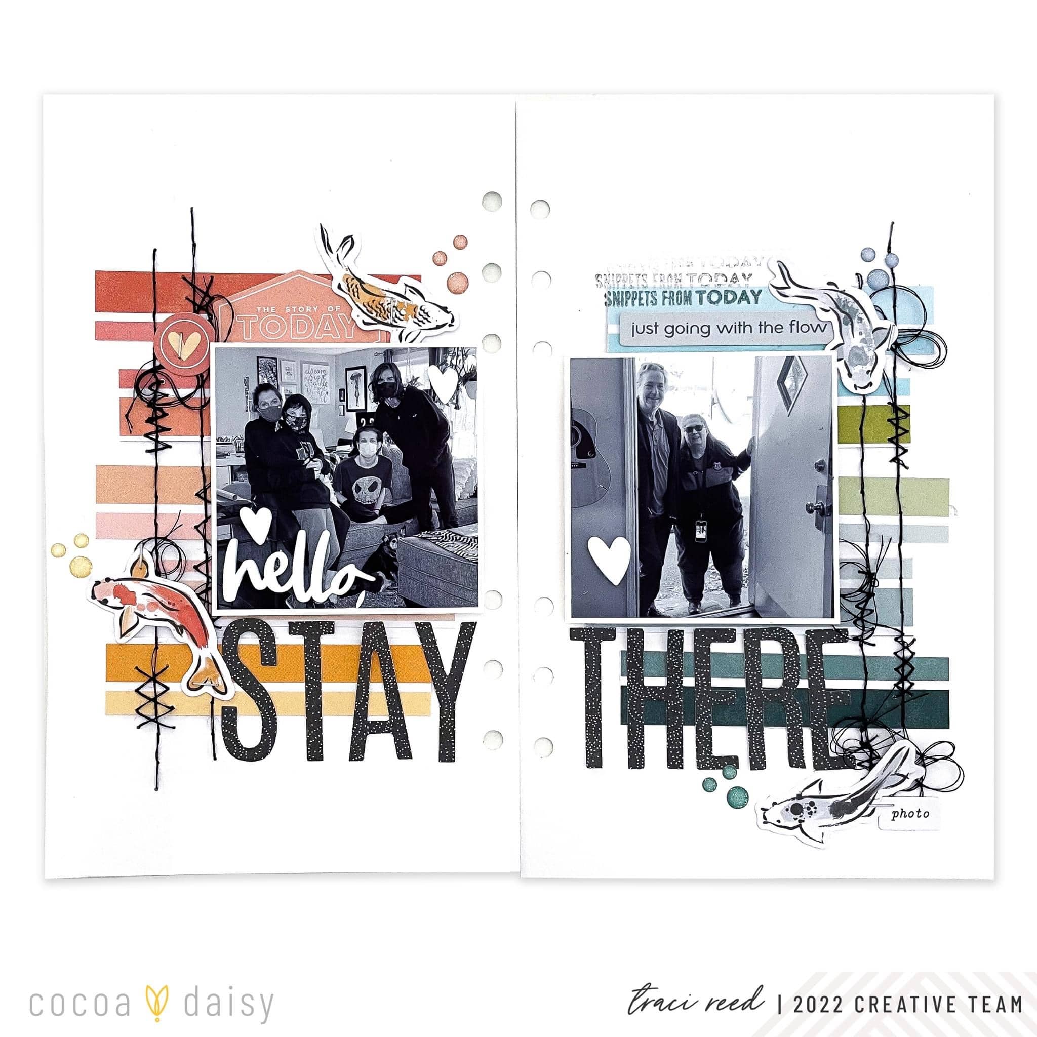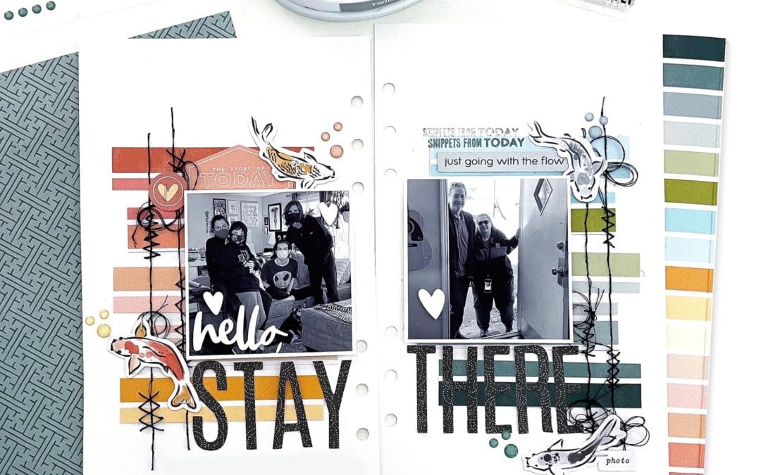 When I started embellishing, I chose to fully embrace the fish for this layout, leaning heavily into the “going with the flow” AND the “separate fishbowls” theme since my photos and story are of a quarantined birthday.