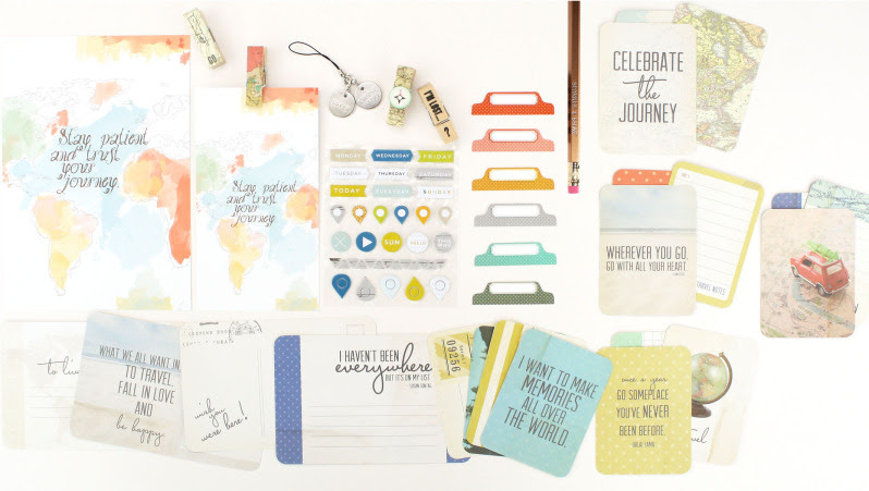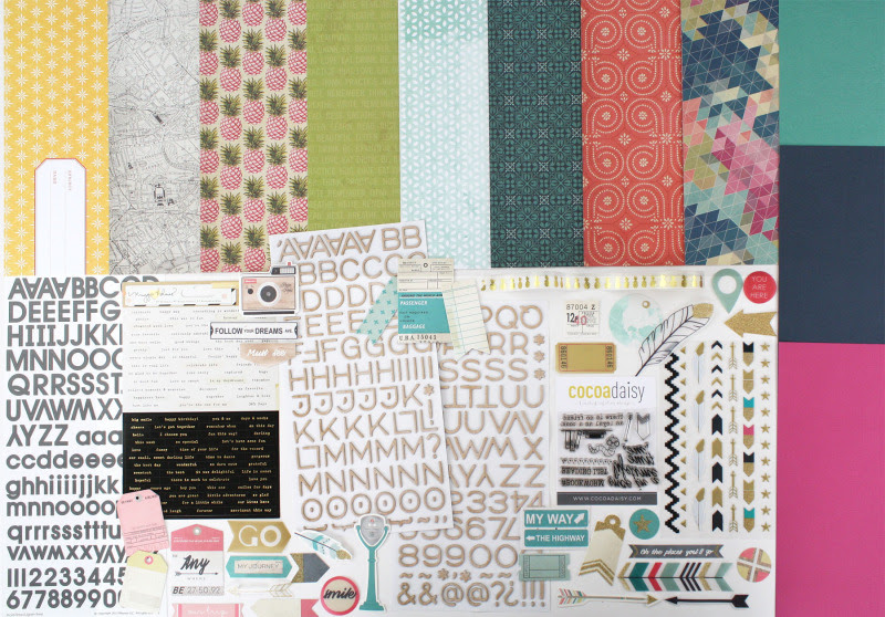 Looking at our August scrapbooking kit, Hemingway, you can almost hear the gentle breezes and lapping sound of sea meeting sand. It’s a beautiful mix of tropical and exploration based on the current collections from BasicGrey, Crate Paper, and Heidi Swapp, plus a good deal of exclusive Cocoa Daisy! Two alphabets (one from American Crafts, the other from Moxxie), a sheet of sticker phrases, puffy stars, arrows and zig zag stickers, as well as a collection of die cuts are a handsome addition. Exclusive stamps from arleigh round out this collection. We think you’ll love it as much as we do!