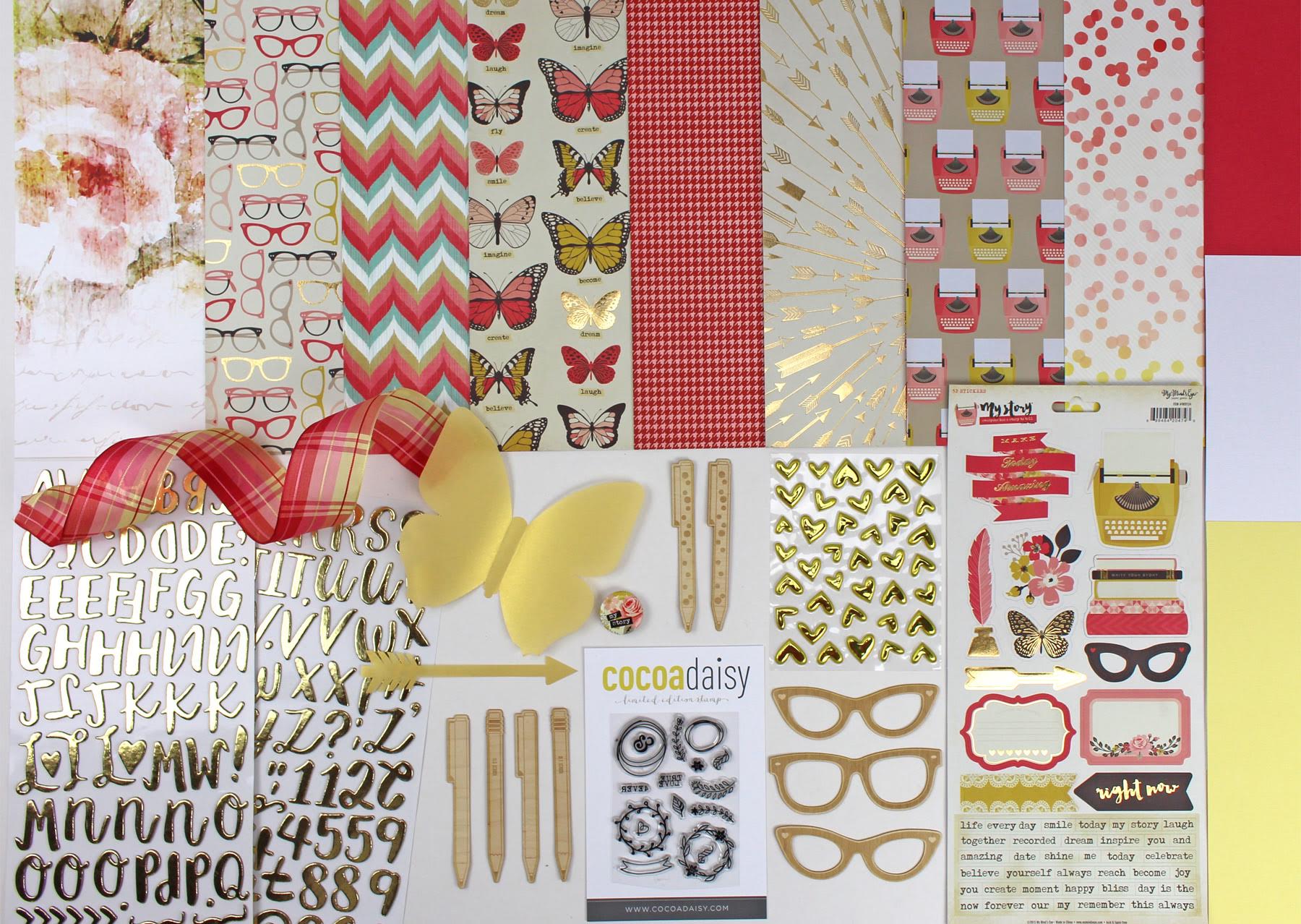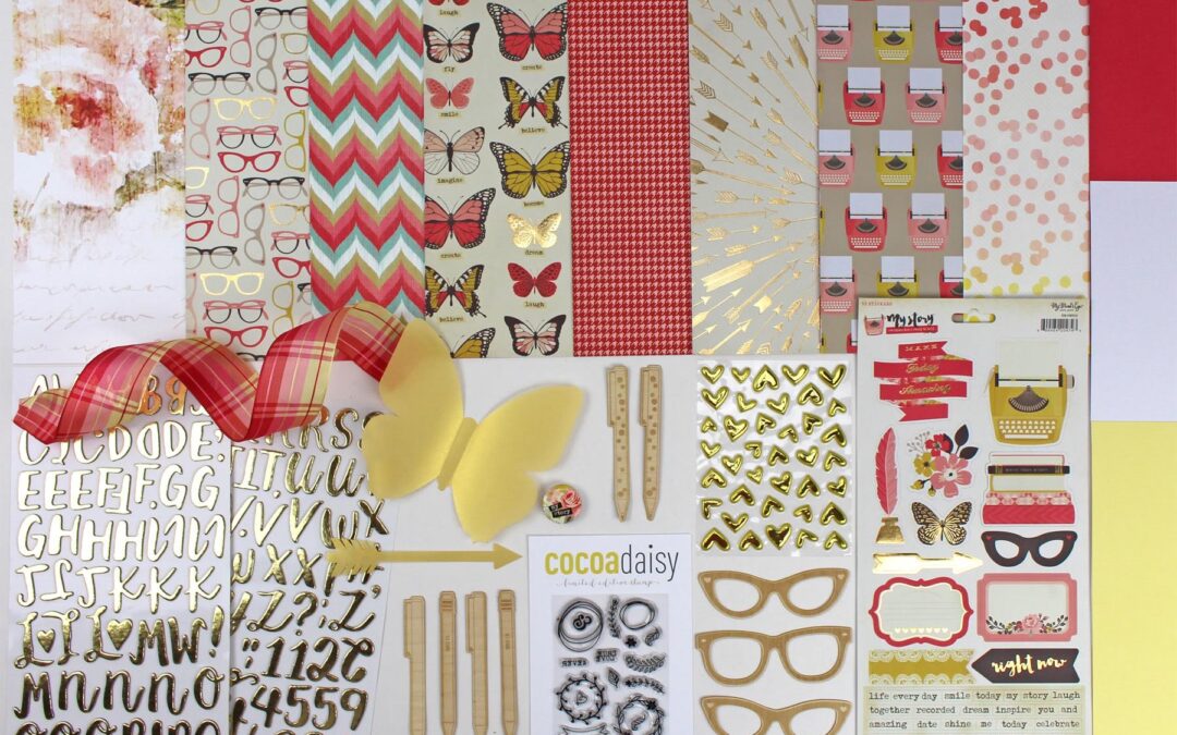 Gold and pink. And on the B sides, you’ll find some blacks,whites, and aquas. There’s something for everyone in our Notebook collection. A great big gold vellum butterfly die cut some unique pens, pencils, and glasses cut from a very thin wood veneer are the exclusive embellishments this month. We’ve also got golden hearts, a sticker sheet, a half yard of wired ribbon, and a shiny gold foil alphabet. Stephanie Wheeler’s exclusive papers tie it all together this month and arleigh’s stamps are going make you swoon!