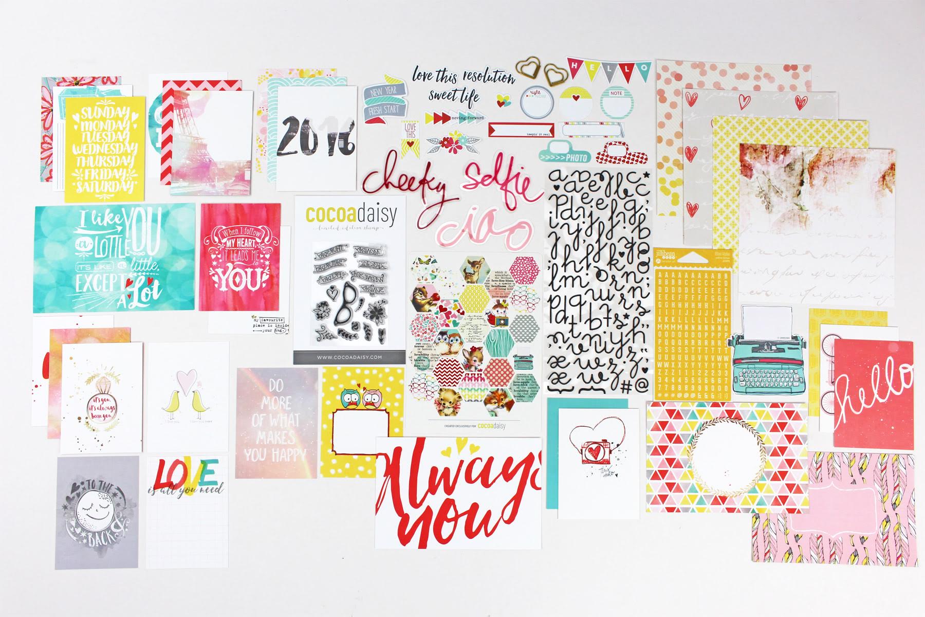 Here’s to a new year where love is in the air! Can you believe it’s time to welcome in 2016? Well, we’re doing it in style with a new designer this month, Valeria, from Little Butterfly Wings Designs. She has created a gorgeous collection of cards featuring a good mix of journaling cards to fillers. A fun sheet of exclusive hexagon stickers from Pretty Little Studios, two different alphabets, some heart clips from American Crafts, our exclusive stamps set, and a selection of acrylic words from Heidi Swapp make documenting easy and enjoyable. We’ve also brought Just Jaimee on board this month with some exclusive die cut shapes that will have you looking forward to yourDay in the Life: January pocket scrapping.