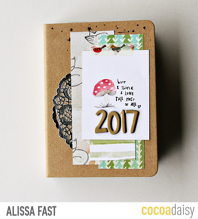 Just layer a few bits over a silver doily, add a journal card and numbers for the title/cover of this mini. It’s super simple.