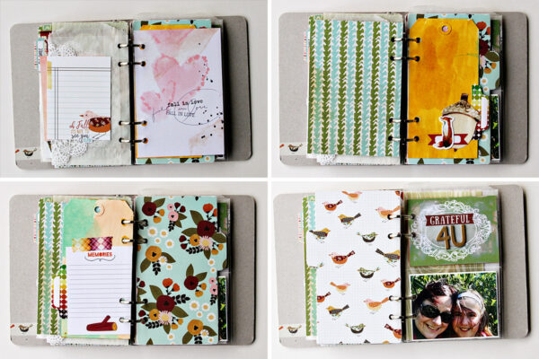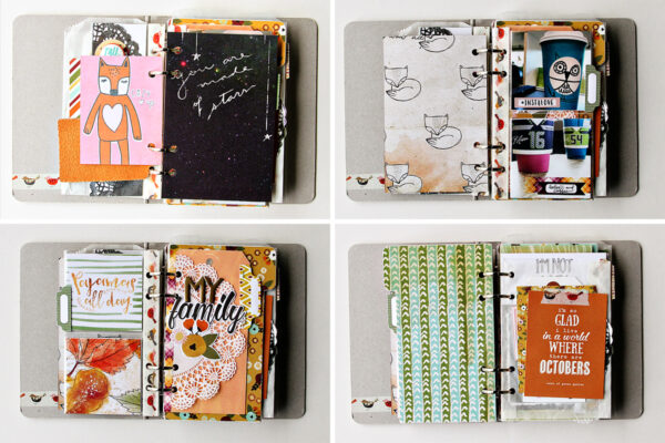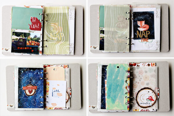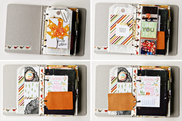 I love using the glassine packaging for pages and I cut down a few 4×6 pocket pages to fit this little book. If the pock page holes don’t line up, cover them with cute washi tape and re-punch. Simple as that! The leather tag is just a sample from a leather notebook company I had laying on my desk and the color was perfect for my fall mini. Just pop it on the binder ring!