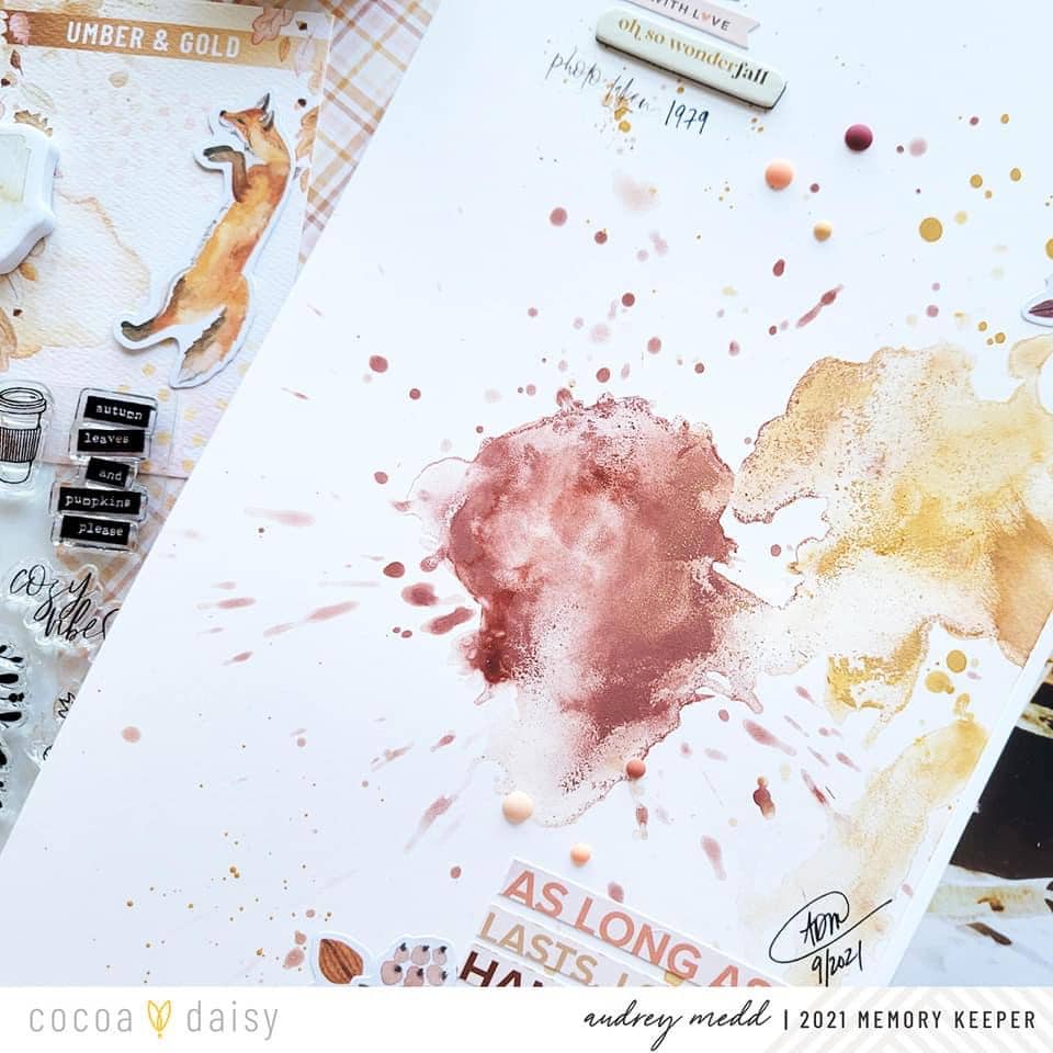 If you have seen the Umber & Gold Collection then you have seen the mixed media elements throughout this collection. We were so inspired by it, that we challenged our Creative Team to create a little mixed media of their own to complement this collection. Let’s see what beautiful spreads they created!