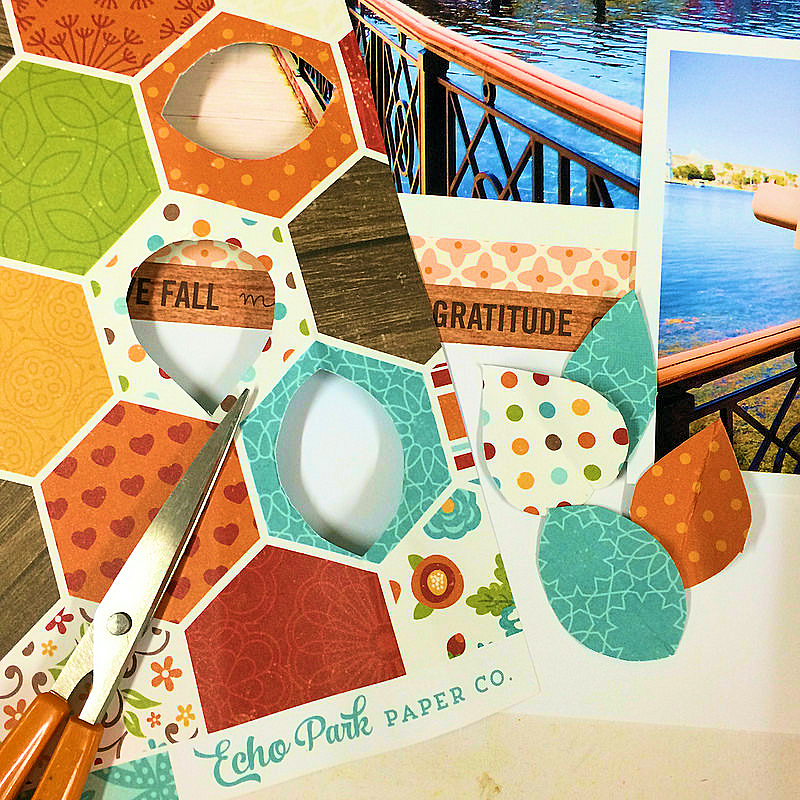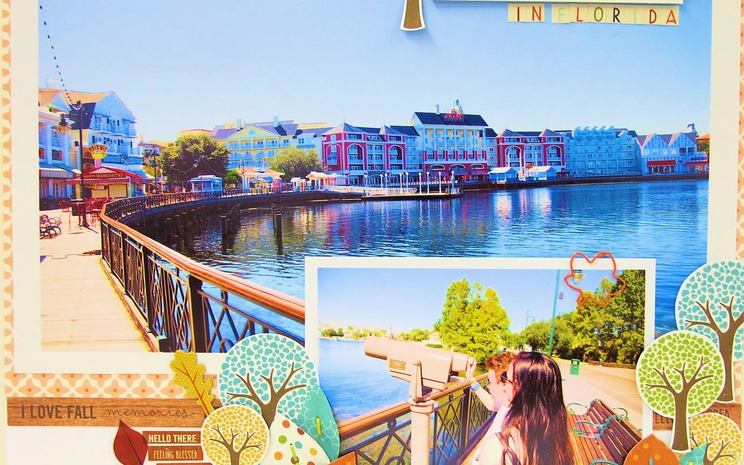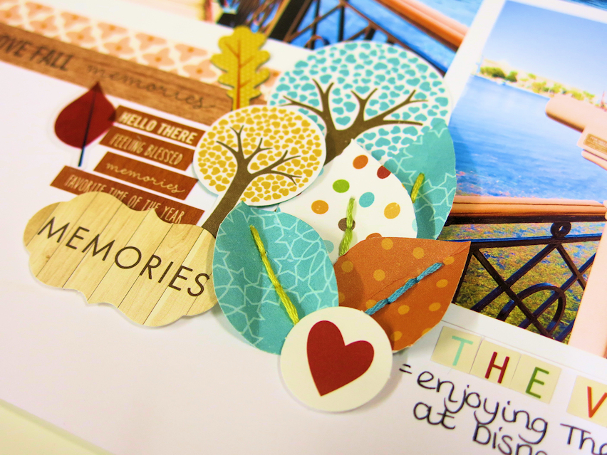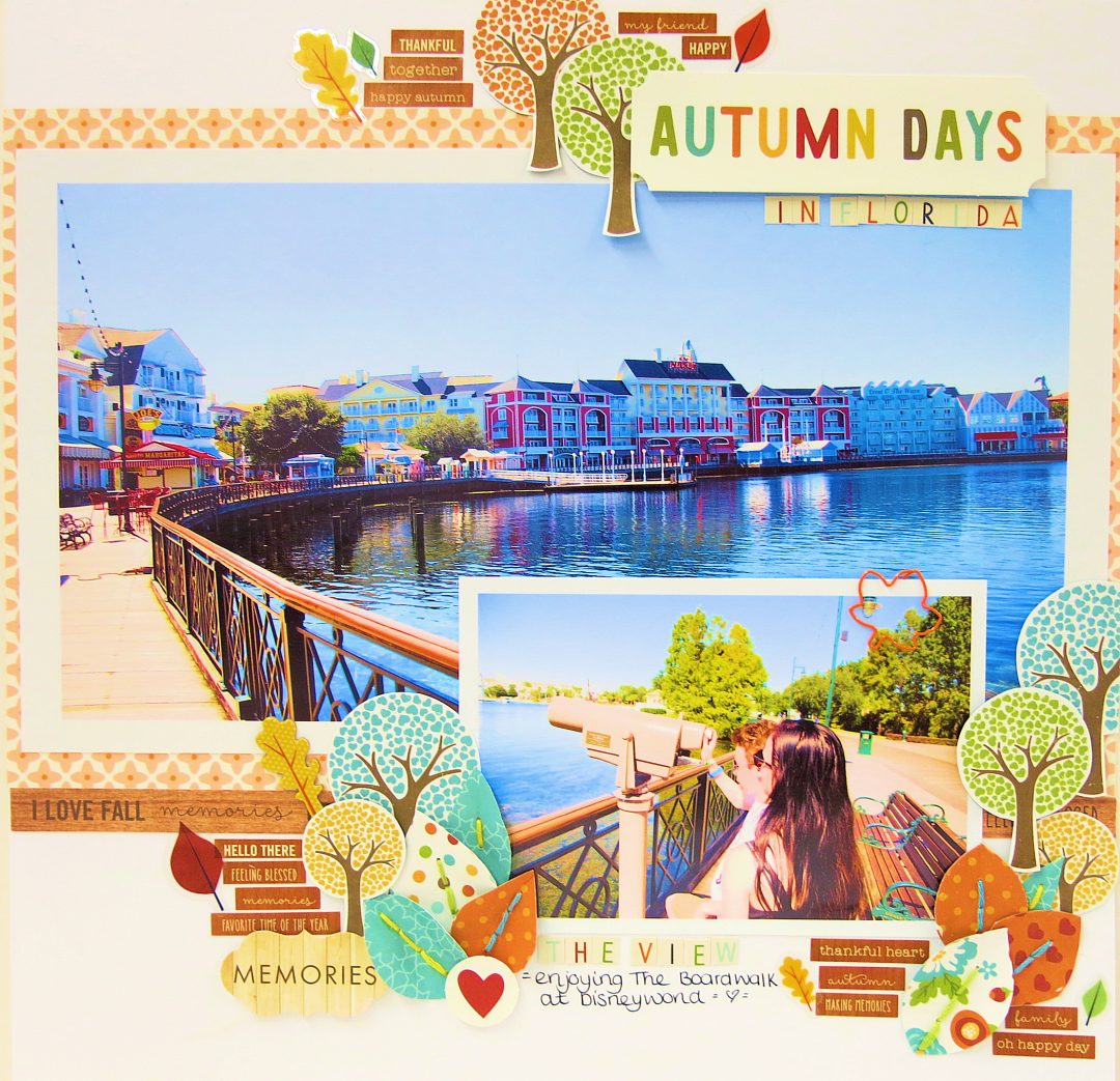 My LO here isn’t the classic Fall that we imagine here in England. This was taken on an October afternoon in sunny Florida. So beautiful. I cut out some trees from the Echo Park paper in the Main Kit and I also created some leaves from another sheet of the Echo Park paper like this.