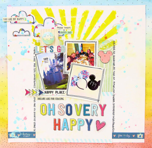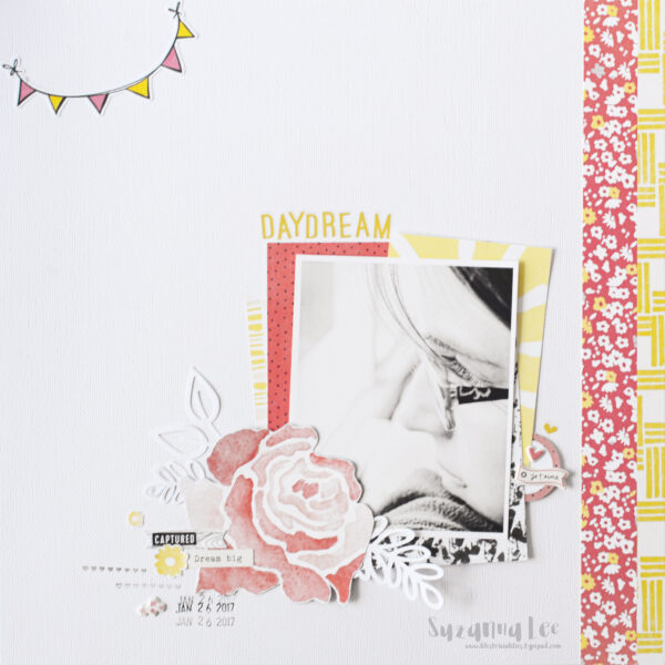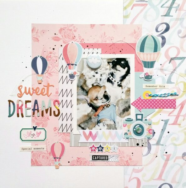 Marie’s layout is so dreamy! I love how she too, used a different sized photo and adjusted her photo layers accordingly. Look at all the fun embellishments from the February kit that she incorporated into this layout!
