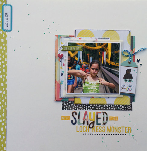 Kelly used a square photo, just as the sketch reflects, but she used a larger photo thus requiring some larger layers behind her photos. I love the classic Kelly look and how she used a fine black pen to outline her photos and draw more definitive edges to them. Like me, she too used the hard edge but went with a smaller size for balance with her picture cluster. What a fun title!
