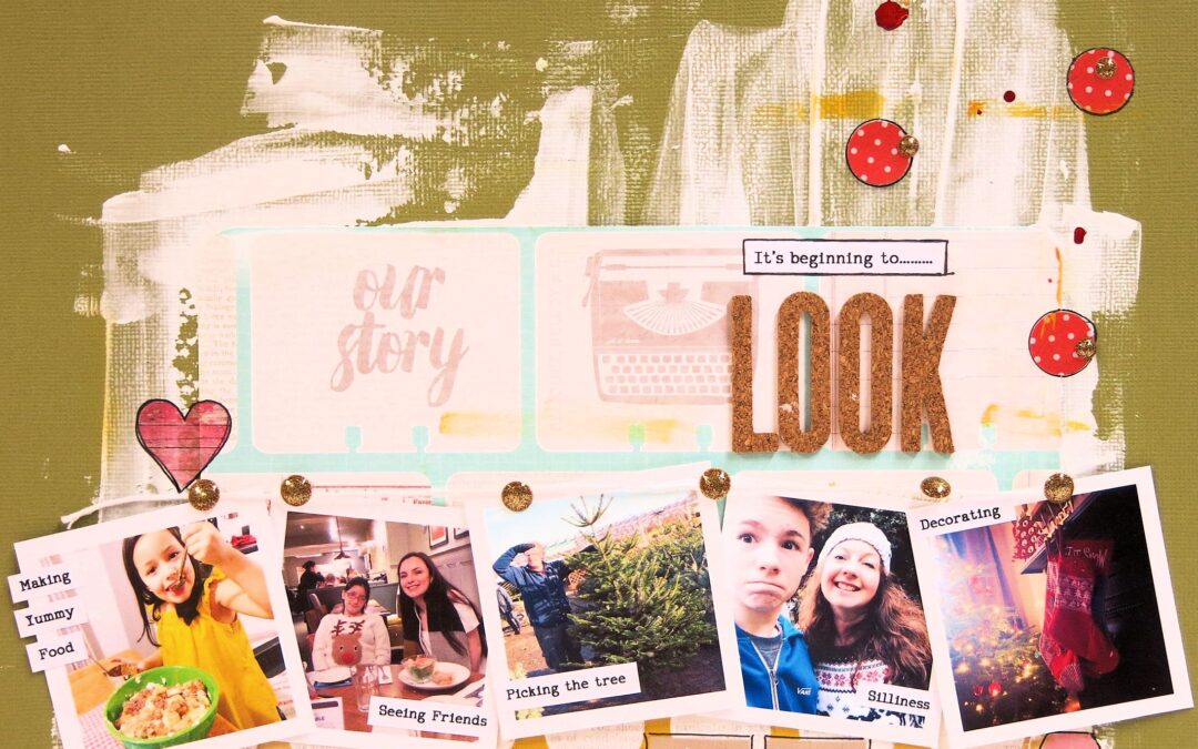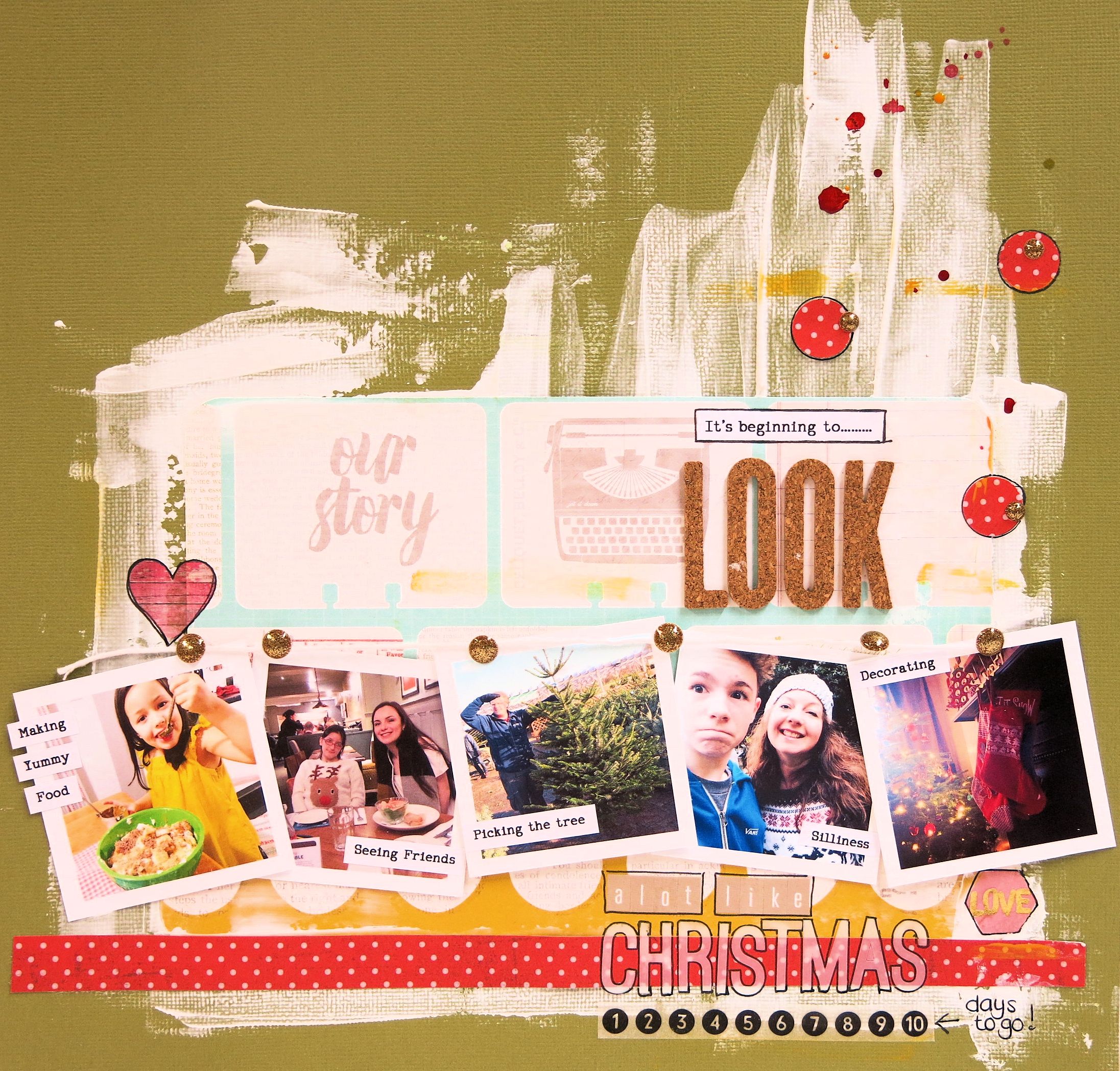Like I said before, I struggle to find the time to scrap this time of year, so for this LO I have 5 different events/memories all on the one page. This just about sums up our December so far. Making yummy food with my little niece at the weekend, meeting special friends for dinner at the beginning of the month, picking the Christmas tree, silliness with our kids and of course the decorating. I’ve crammed it all in to the one LO and yet it doesn’t feel too busy and over crowded. I like to add big white borders to my photos. I think when grouping them together like this it keeps it clean and separates the photos nicely so they don’t blend in to one another. I was also careful with how I ordered the photos, making sure the 2 of the outside were in contrast with the background colour. If I would have had the tree photo on the end, the green on the green just would not have the same effect. And to add a Christmas feel…..it’s the pops of red again. Works everytime. You don’t need loads….just a little here and there and it really makes a difference.