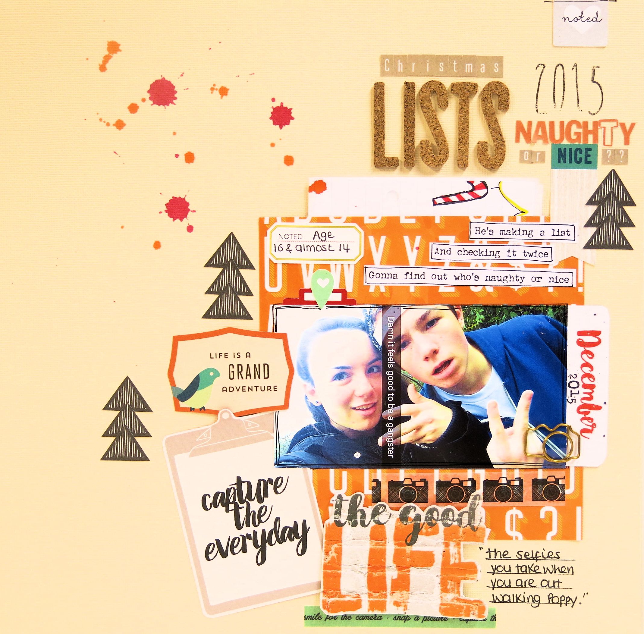 This was my first one. It’s not a Christmassy photo, infact it’s just a normal everyday photo of my two teens. They are always taking silly selfies together and took this one and edited it with silly wording whilst out walking the dog last week. I like it though as it’s very typical of their silliness. I’ve used this LO to home their Christmas lists. Each year I ask for a list. What a few years would have been a letter to Santa. They still write them out in a similar style, it’s never just a list. Hollie even decorated her’s by drawing decorations and candy canes all over it. I think it’s fun to keep things like this. So using the CD paper, I stuck it down leaving the top side glue free to make a pocket and folded their notes to slide inside. I love the fact that they are kept safe now.