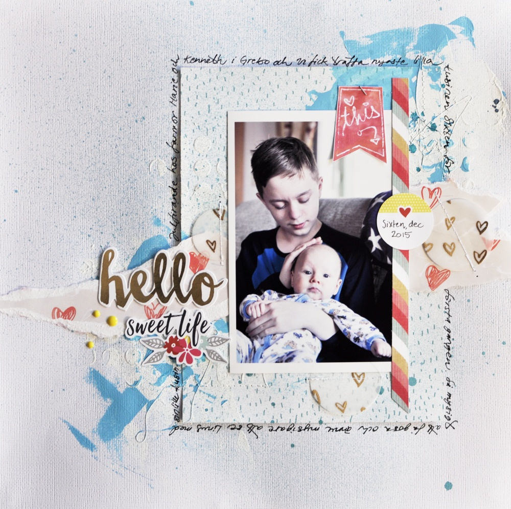 My own layout is about my son and one of his little cousins. My journaling isn’t only telling the story about their first meeting this Christmas, but it also works as a frame around central elements of the design.