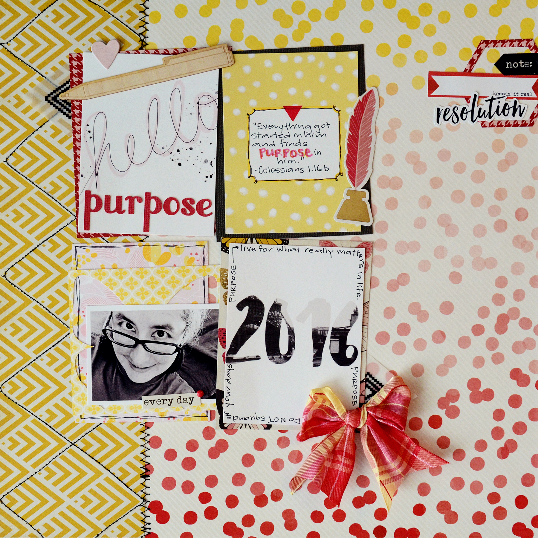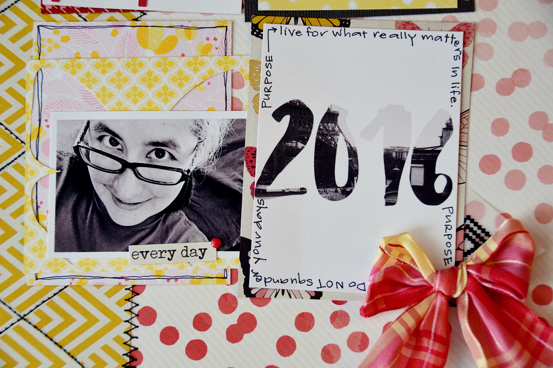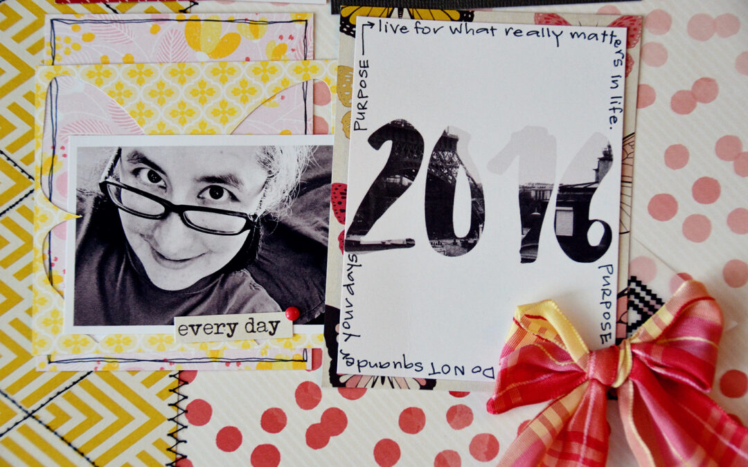“This was a tough challenge for me! I typically don’t include a lot of journaling on my layouts as it is visually disturbing to me often times. I had to find a way to incorporate the journaling into my design. In this instance, I wanted something dark around the 2016 pocket card, rather than my go to fine line pen, I journaled. Thanks for making me step out of my comfort zone Anna!”