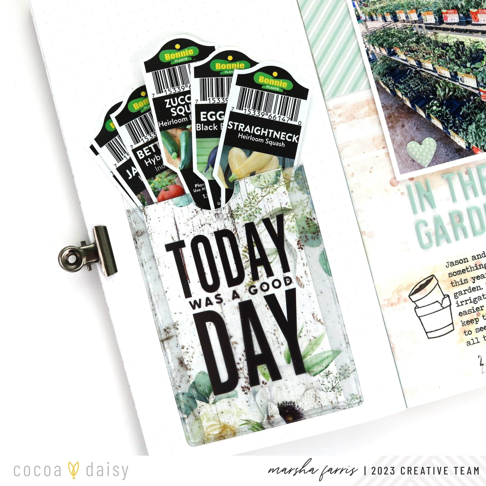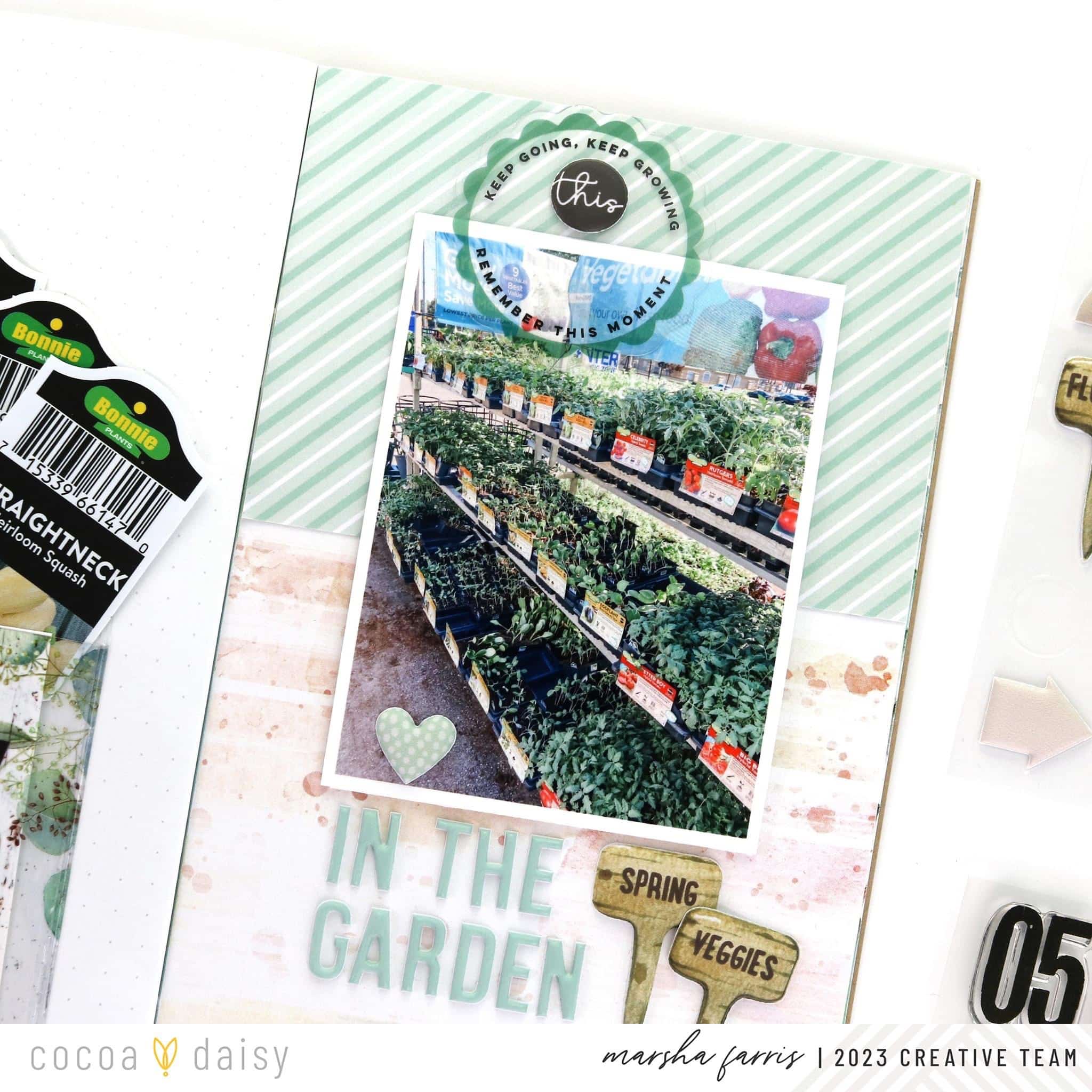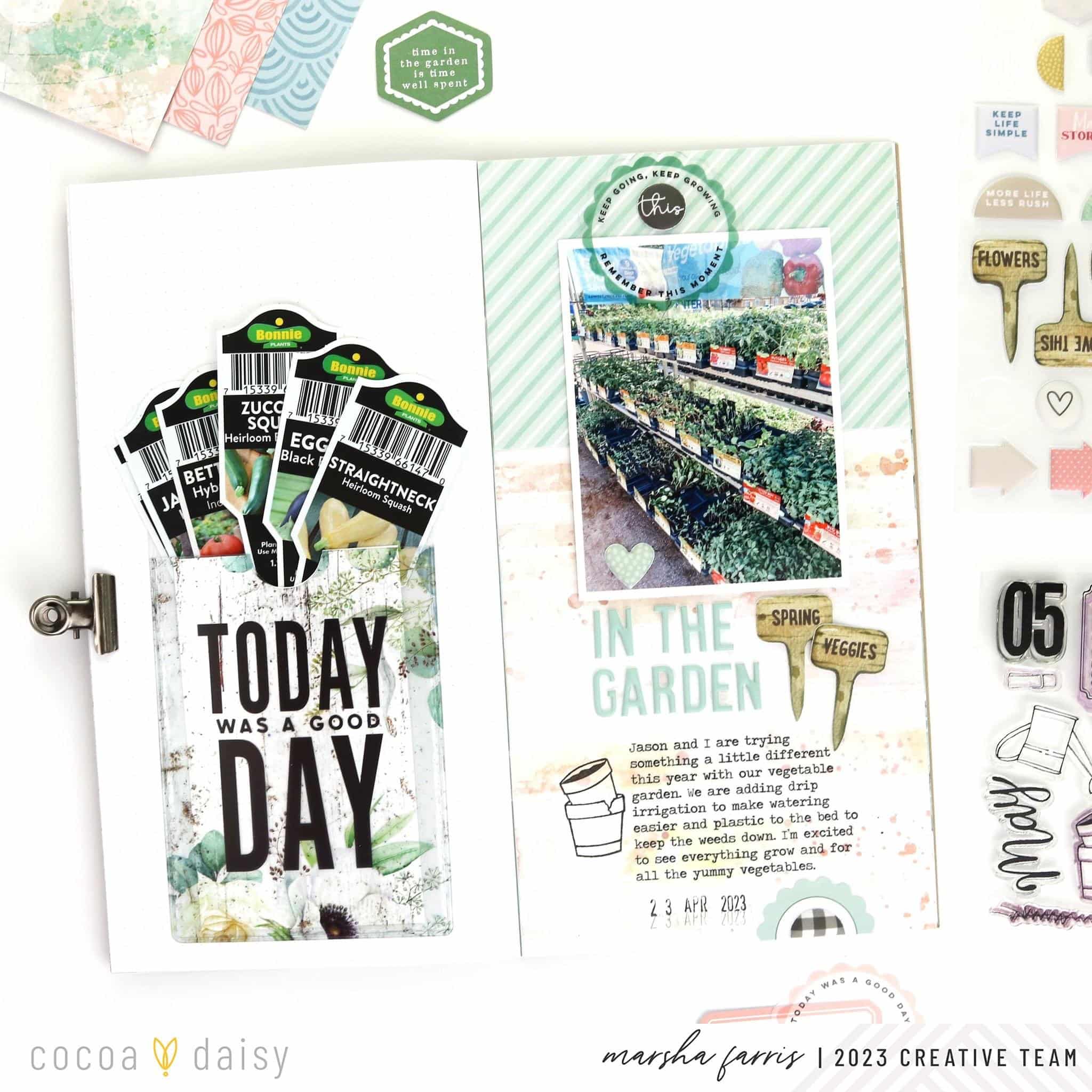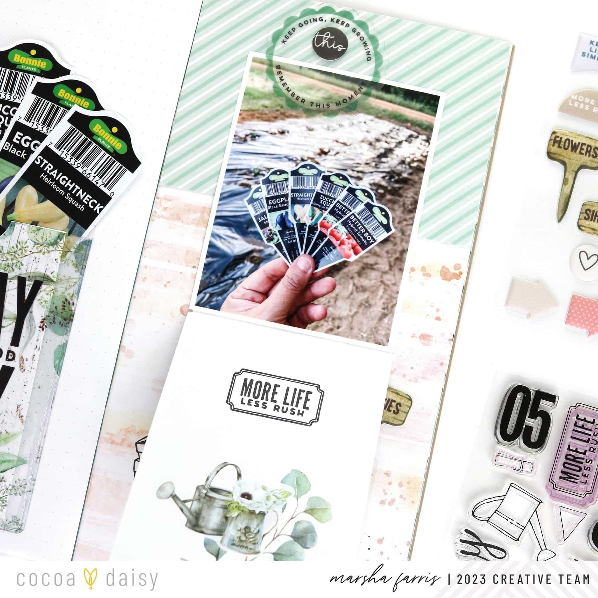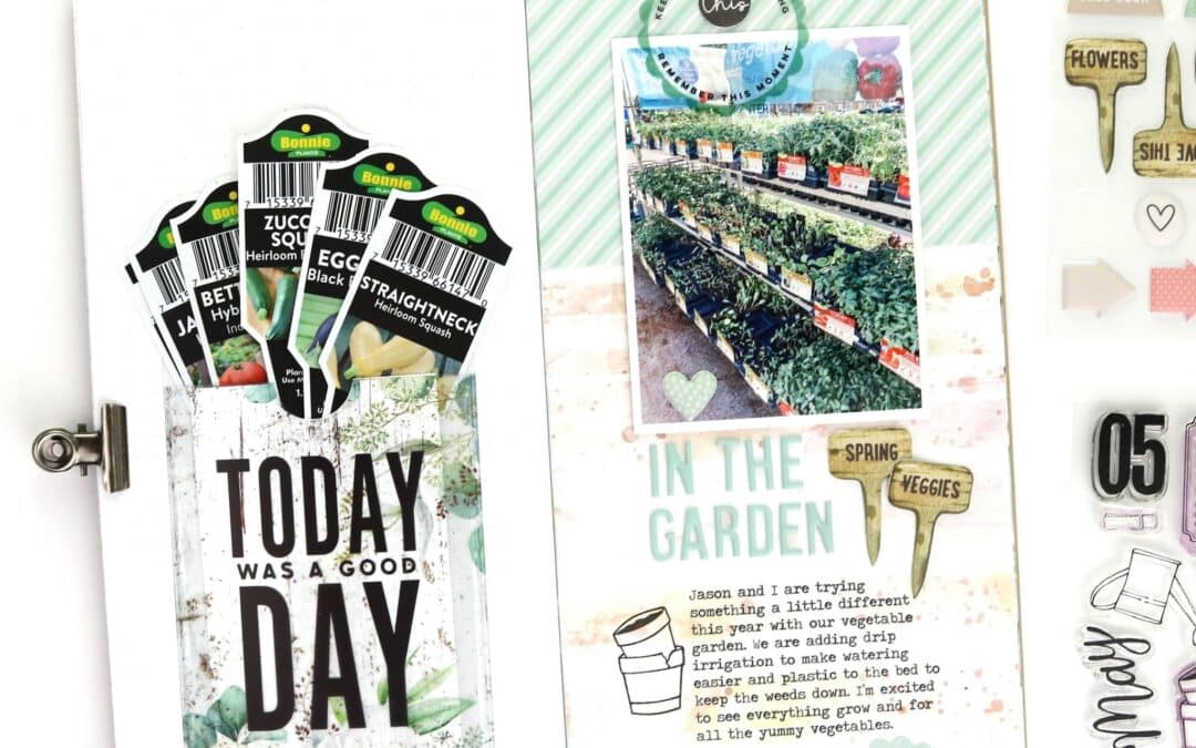 This month’s Lillian’s Garden Traveler’s Notebook Memory Keeping Kit includes a fun adhesive pocket, and I was excited to use it on a layout. My family plants a vegetable garden every year, and I thought the pocket would be perfect for holding the tags from our vegetable plants.