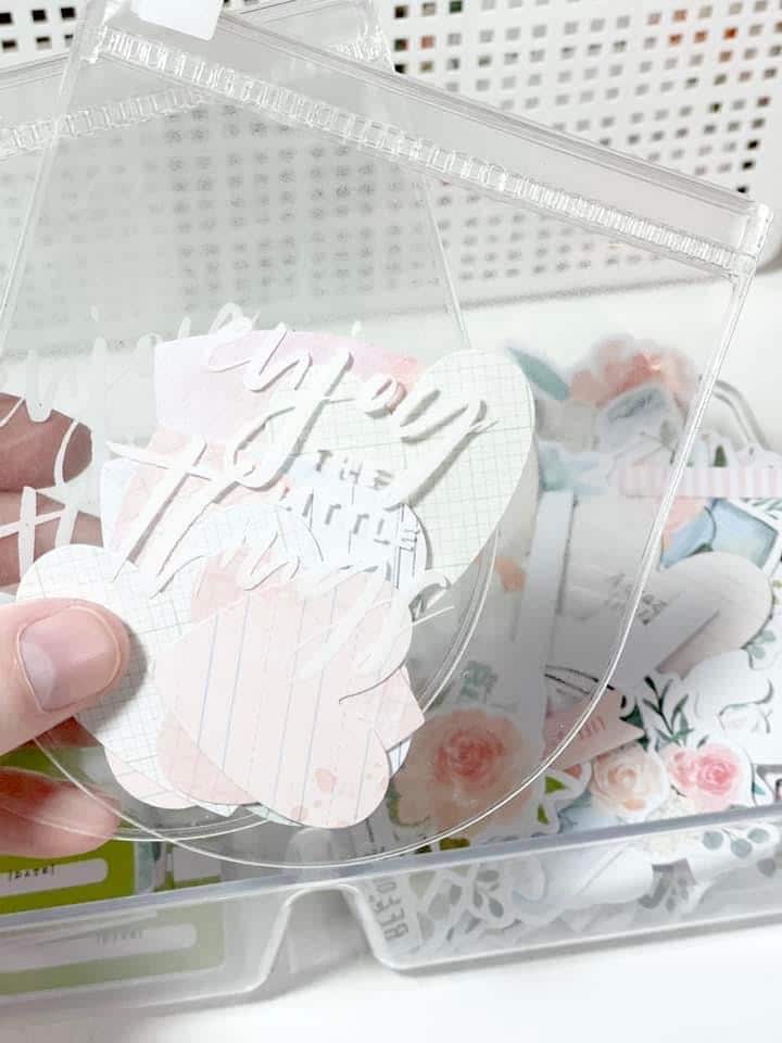 The die cuts are one of my favorite Cocoa Daisy products. I love to add them to my planner! I usually keep them in an acrylic tray on my desk (so pretty!) but love this new on the go option from the Elegance Blooms Traveler’s Notebook Memory Keeping Kit; a little plastic sleeve that is not only 💯 adorable but also makes setting up my planner pages on the go even easier. Plus, the die cuts have adhesive backs already, so you just pull and stick. No extra adhesive or glue is needed!