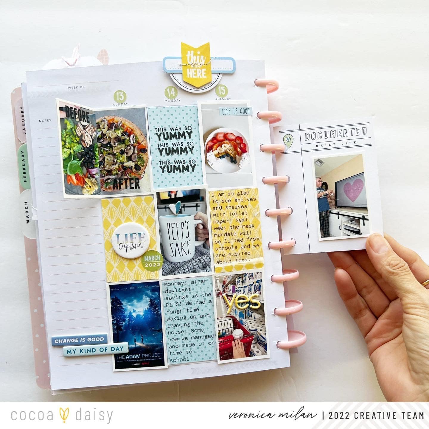 “My memory planning is like a graphic novel of my life, and I love filling my pages with all the little things that tell the story of life right now. When I work in my memory planner, I stick to a one page at a time system. That means, I choose to work on the left page in one crafty session and the right page at a different time, keeping this creative project totally manageable!
