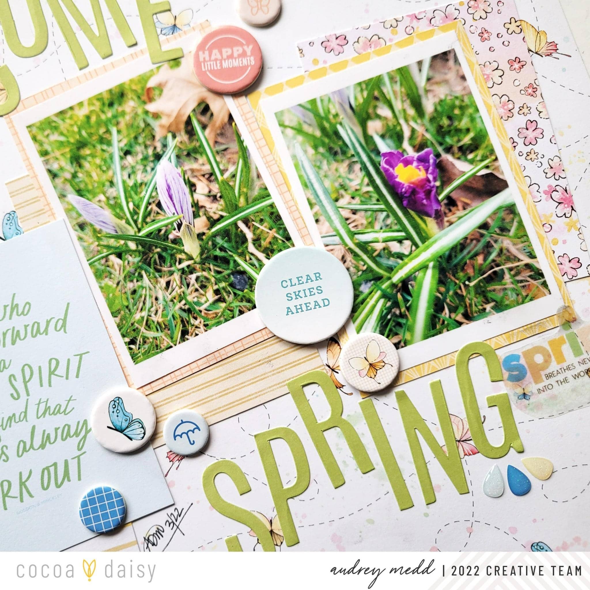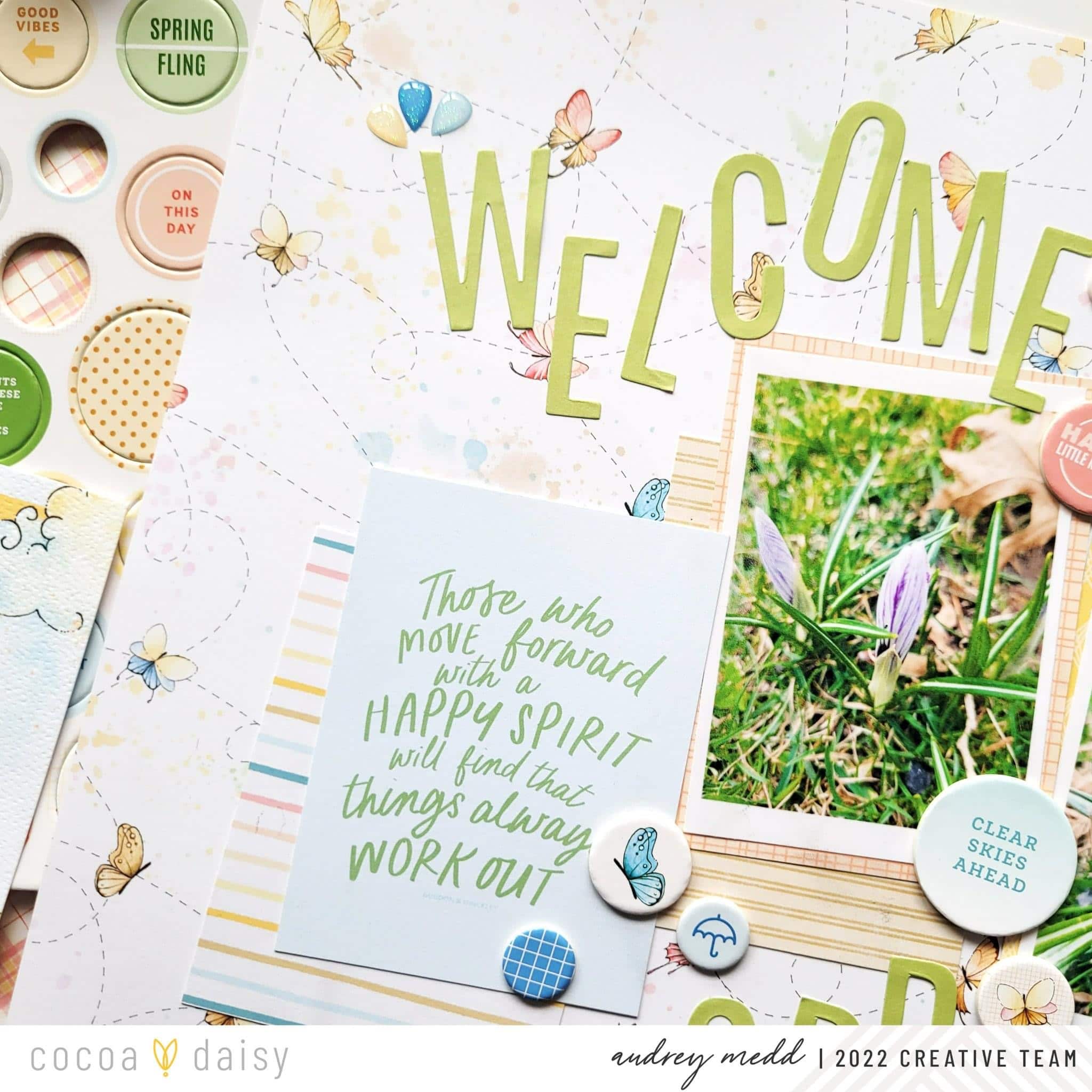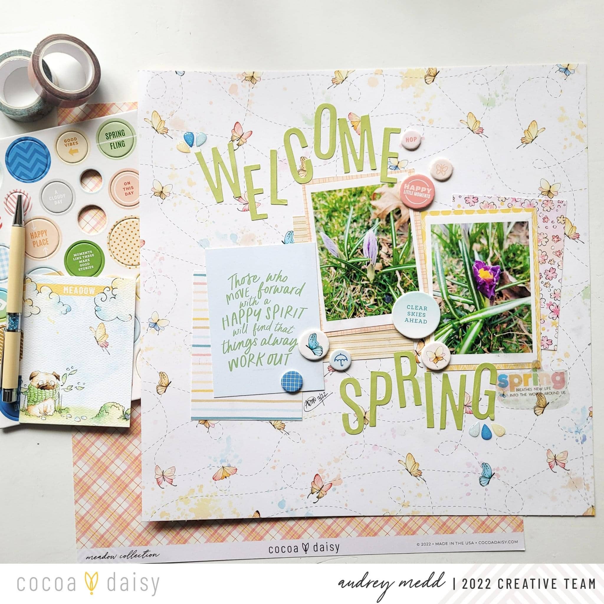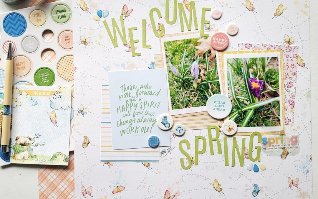 I ended this layout with my title “Welcome Spring,” using letter stickers found in the Meadow Classified: Memory Keeping Kit. I placed the letters somewhat wonky to give the title emphasis. This was a pretty easy layout to pull together, but super fun to make! How will you celebrate spring?”