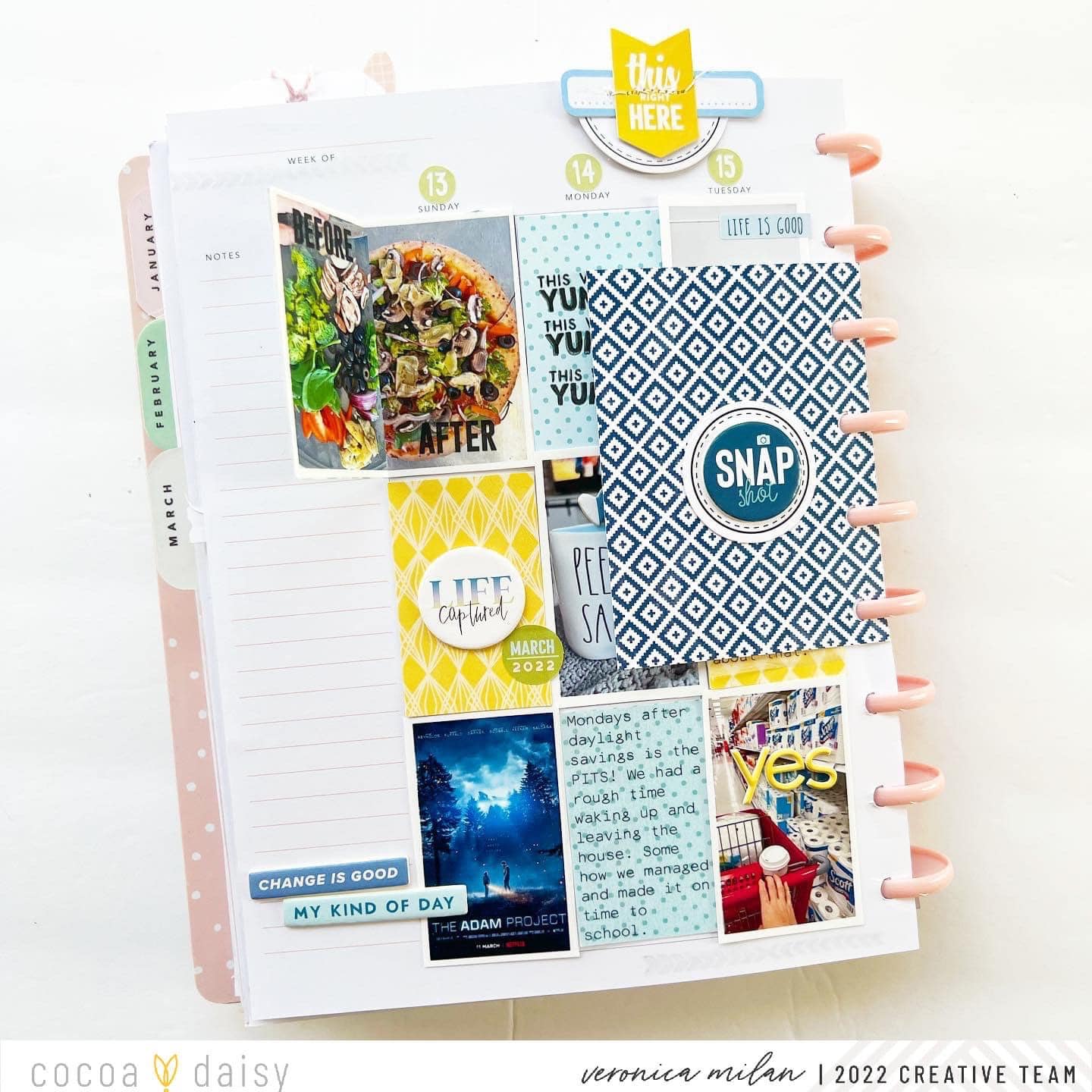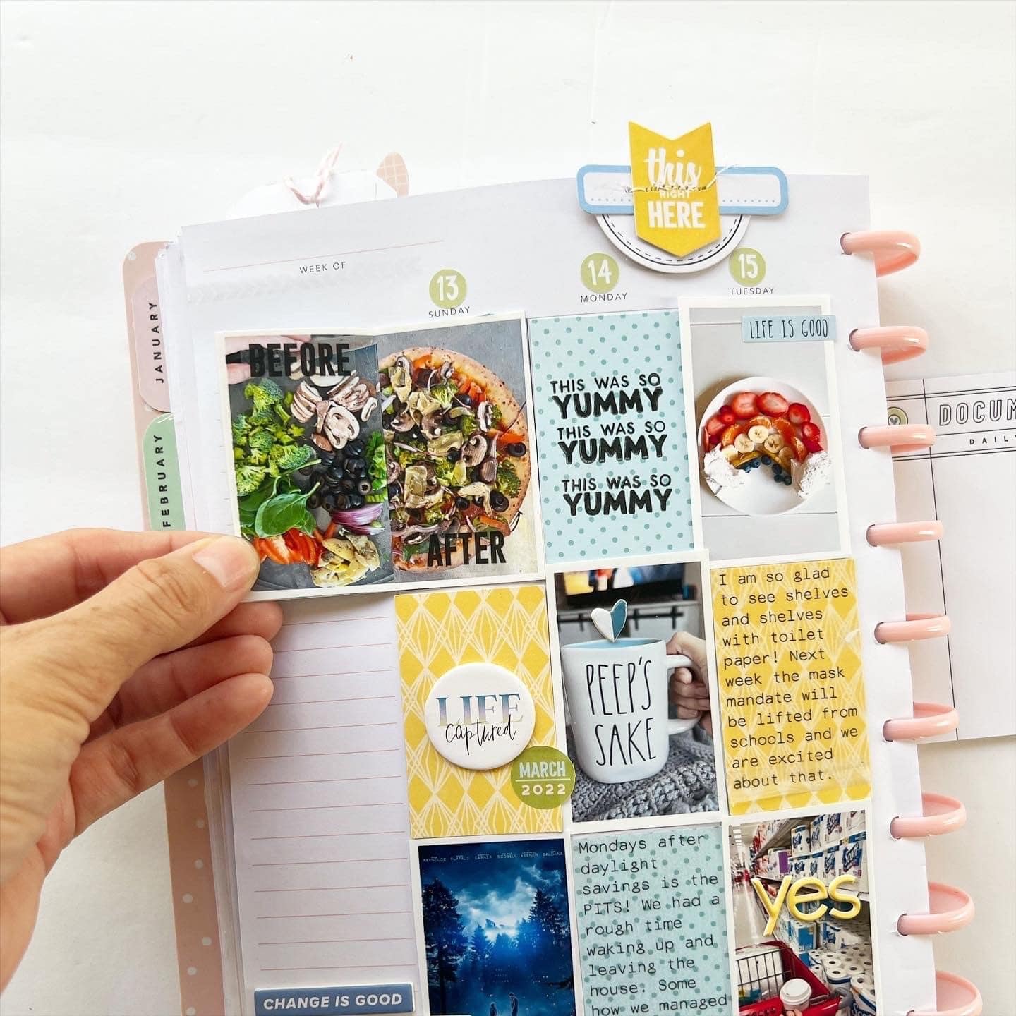 For this spread, I absolutely loved using all the springtime colors, graphic patterns and seasonal sentiments from the Meadow Modern Memory Keeping Kit. Even though this kit is geared toward pocket page memory keeping, I have no problem utilizing it in my memory planner. The papers and pocket cards get punched (with the Classic Happy Planner Punch) to fit in this format and add other elements like puffy alpha’s, chipboard pieces and diecuts to embellish as I go.