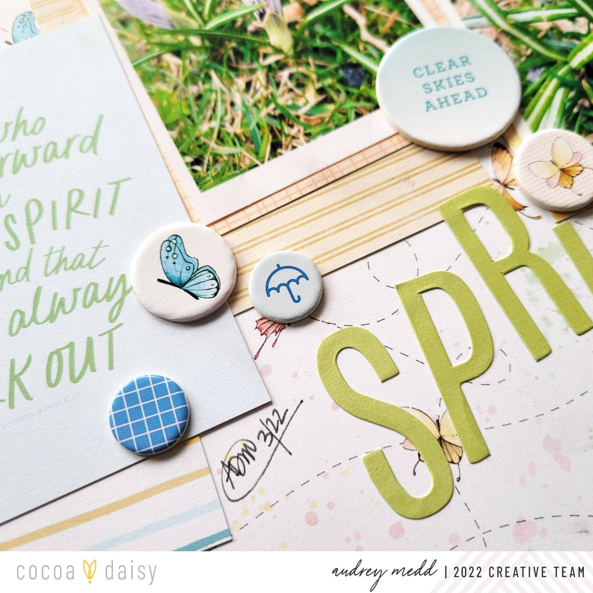 Next, I added some dimension with the chipboard circles found in the Meadow Travelers Notebook Memory Keeping Kit and the Meadow Modern Memory Keeping Kit I clustered them in twos and threes around the page using some sentiments that welcome spring and some things to find in spring, such as rain and bunnies.