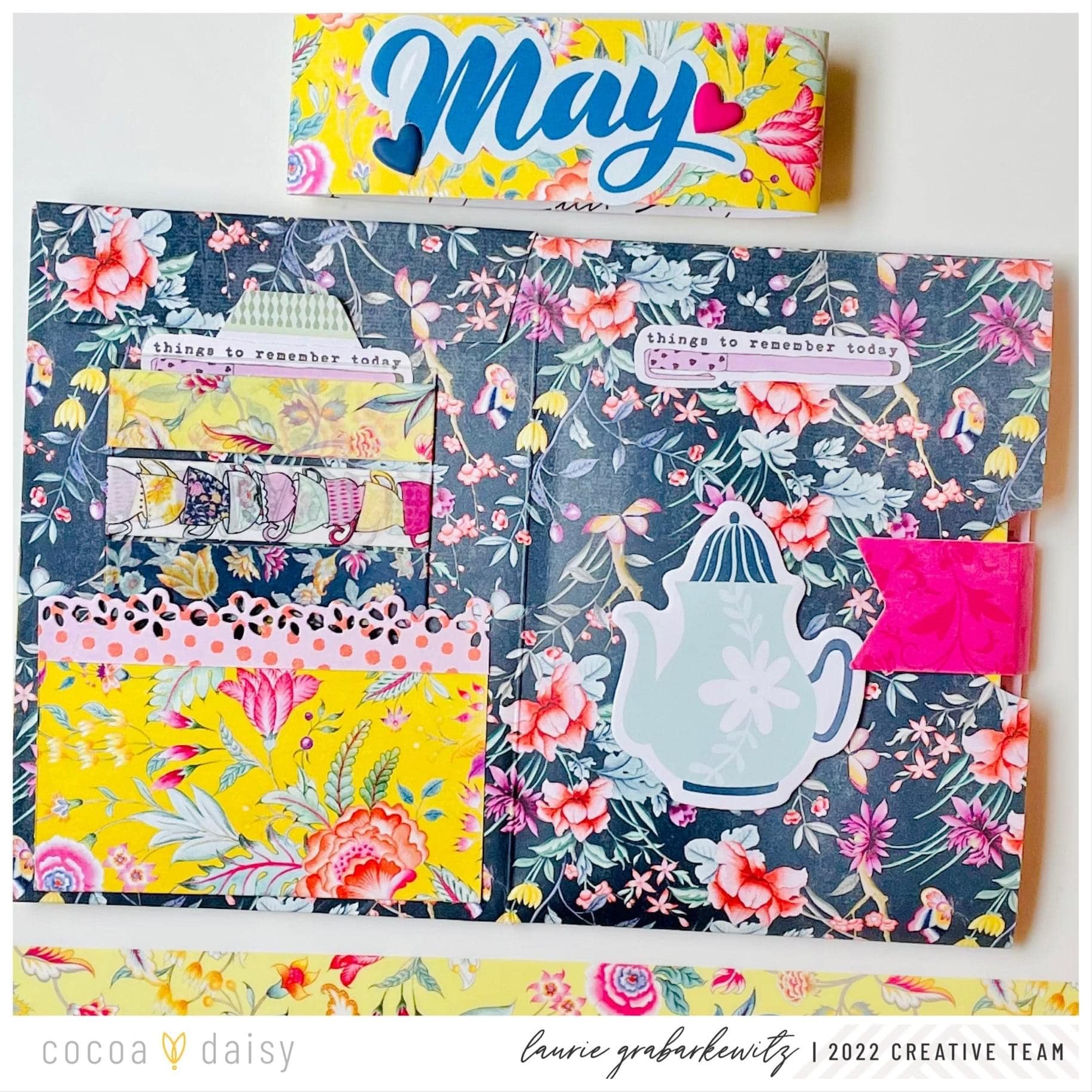 This month’s theme is one of my all-time favorites from Cocoa Daisy!!! I love all things tea-related. Also, the colors are so vibrant and beautiful that I knew as soon as I found out that Christine was offering Afternoon Tea 12 x 12 papers I had to have them. This month my husband and I are also traveling to Europe so my planning needs will be a bit different. I decided to also purchase the Afternoon Tea Mini Dori to use on our trip. Here is where the 12 x 12 papers come into play. I took one of the beautiful chintz papers and constructed a pocket to keep my Afternoon Tea Mini Dori safe. I followed a YouTube tutorial from Joie de Fi to make this little pocket/holder. I really like how it turned out. I can either put it inside the planner pouch that came with the kit or just carry it in my purse as is.